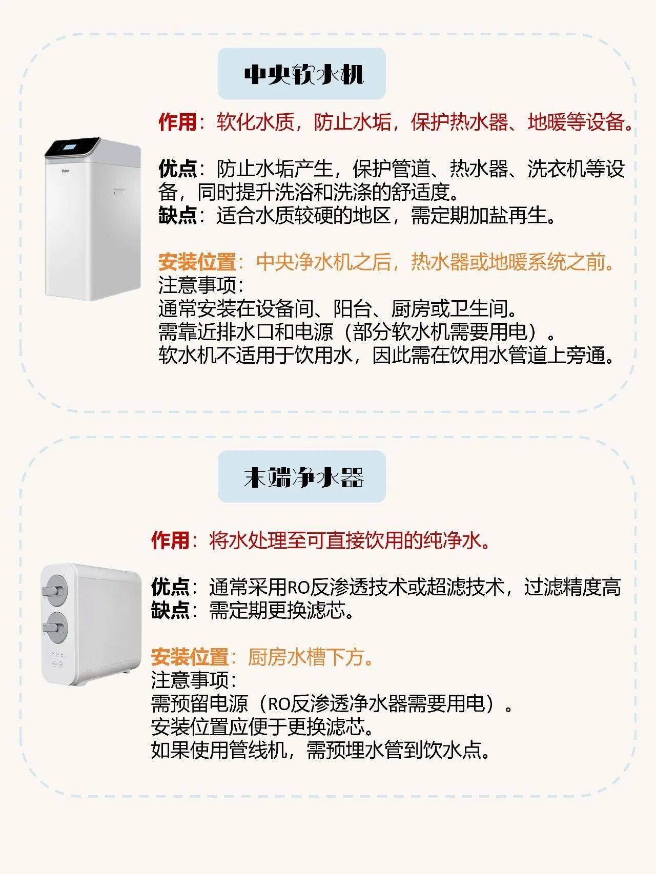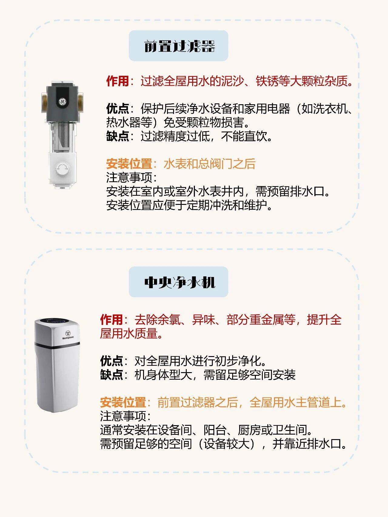 但是这些设备比较占用空间,所以装修的时候要提前预留好位置,别墅用水量大,要提前预留设备间。普通家庭选择常规款就可以,尺寸小,放到橱柜里面就可以了!