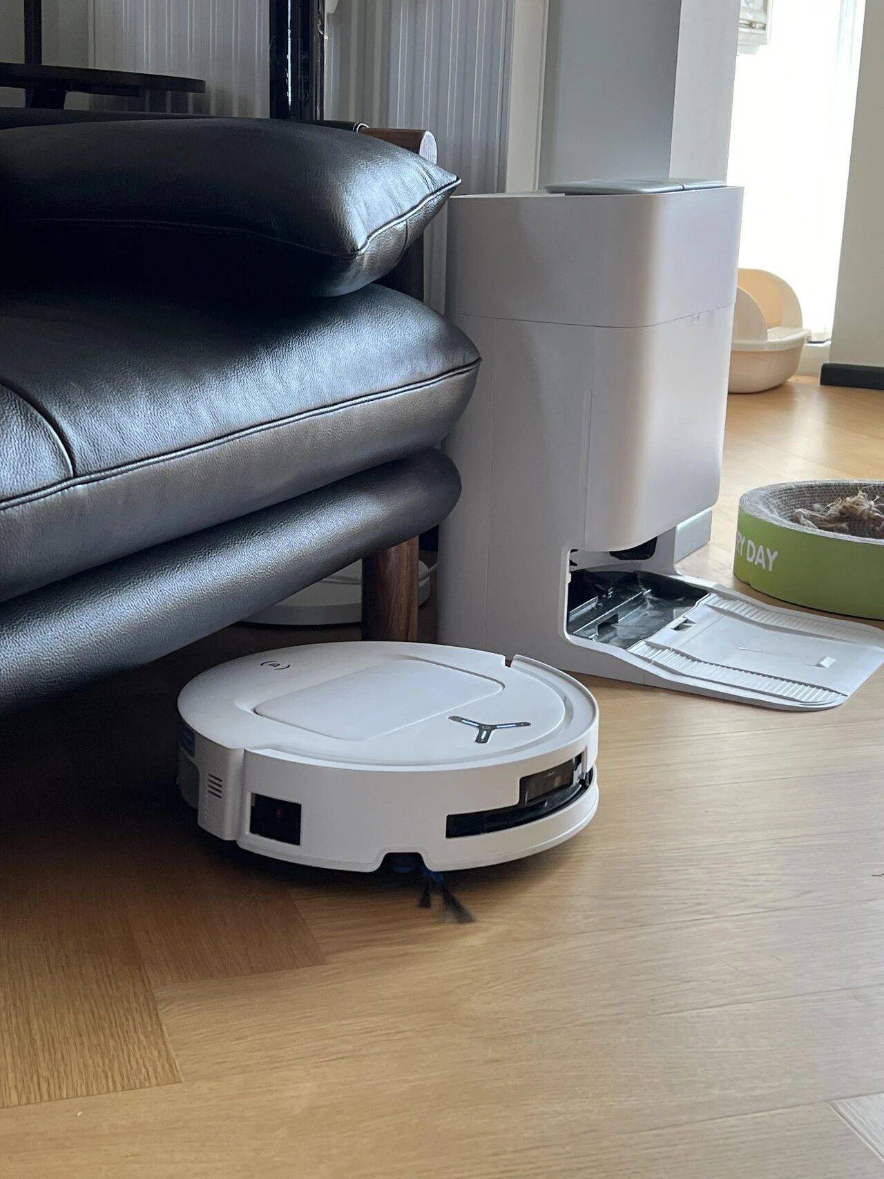 划重点:在装修的时候,要提前预留好上下水和插座,选择自清洁的全自动扫地机器人。安装位置,放在阳台洗衣机柜旁边,或者卫生间浴室柜下方。尽量隐藏好。不然像我家,没有提前预留,虽然也能用,但是明管裸露,很难看的
