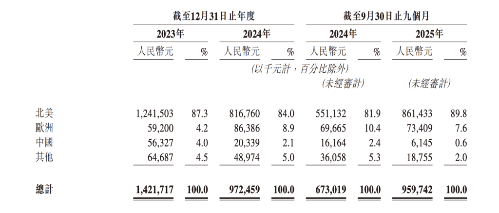 数据显示,2023年及 2024年以及截至2025年9月30日止九个月,公司的海外收入分别占总收入的96%、97.9%及 99.4%,而来自美国市场的收入则分别占总收入的79.6%、68.5%及81.2%。
