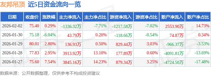 证券之星消息,截至2026年2月2日收盘,友邦吊顶(002718)报收于75.4元,上涨0.29%,换手率4.24%,成交量2.31万手,成交额1.73亿元。