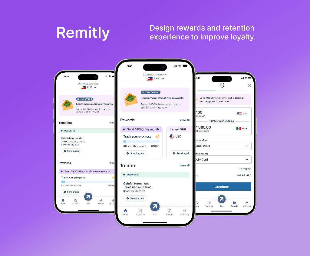 她主导的 Remitly Rewards 忠诚度体系 覆盖 6 个国家,用户参与度提升 78%。在这个项目里,设计不再只是界面,而是被用来回答一个更难的问题:为什么用户要一次又一次回来?
