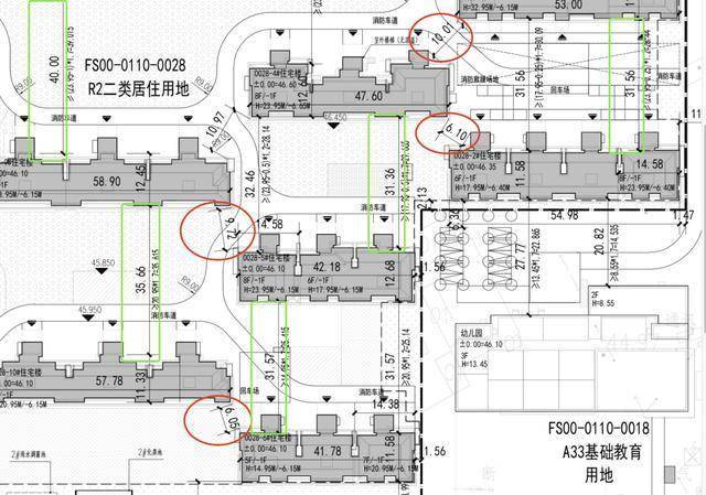 例如,2号楼与西北侧的5号楼,最小距离为6.1米;