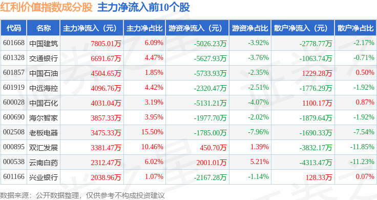 资金流向方面,红利价值(989016)指数成份股当日主力资金净流出合计8.07亿元,游资资金净流入合计1.37亿元,散户资金净流入合计6.7亿元。成份股资金流向详情见下表: