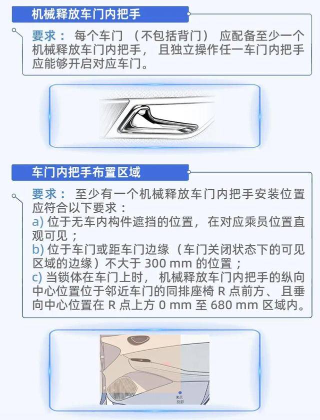 第二,针对车门内把手操作便利性差、部分场景下功能丧失,该标准提出了机械释放车门内把手、布置区域的要求。
