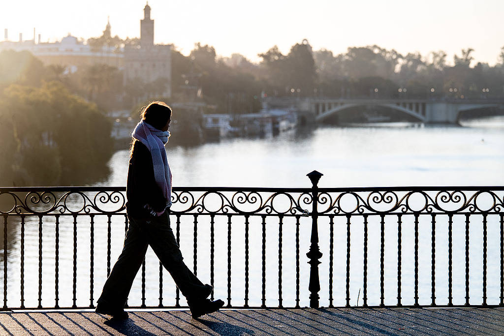 当地时间2026年1月7日,西班牙塞维利亚,行人在寒潮期间穿过特里亚纳大桥。视觉中国 图