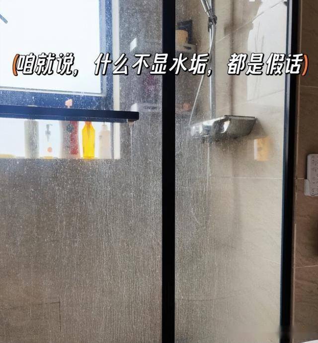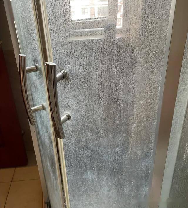 但是整个玻璃浴室的门上全都是水垢,不定时清洁的话,水垢就会越来越厚,最后形成卫生死角。
