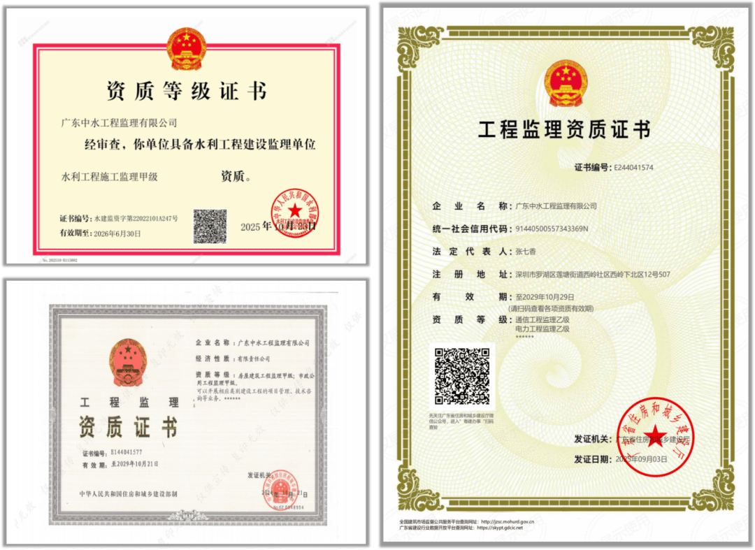 2025年4月,我们迎来了一个重量级好消息:水利部水利工程施工监理甲级资质成功延续! 至此,中水监理已手握 “三甲两乙” 资质阵容——水利、房建、市政三大甲级,辅以电力和通信两大乙级。这意味着我们能承接更多元化的重点工程和民生项目。