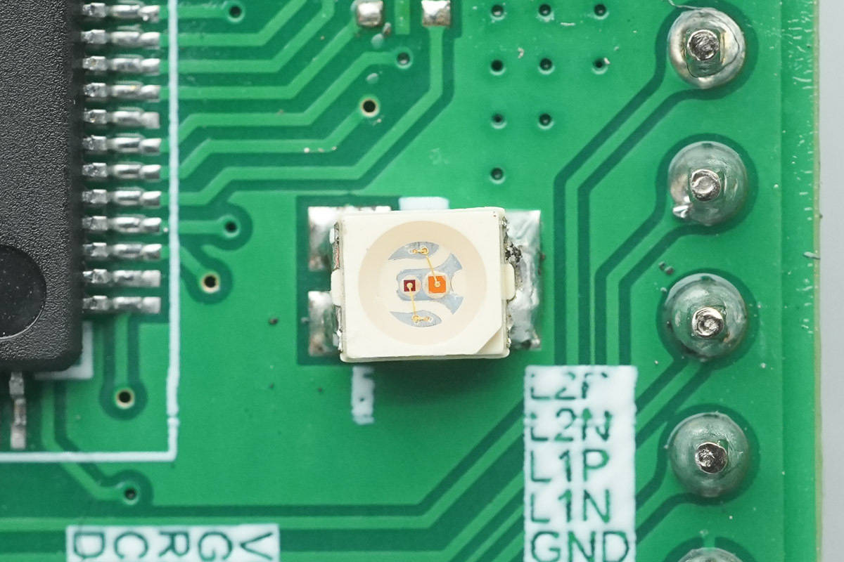 这块控制小板正面分别分布LED指示灯、主控MCU以及晶振。