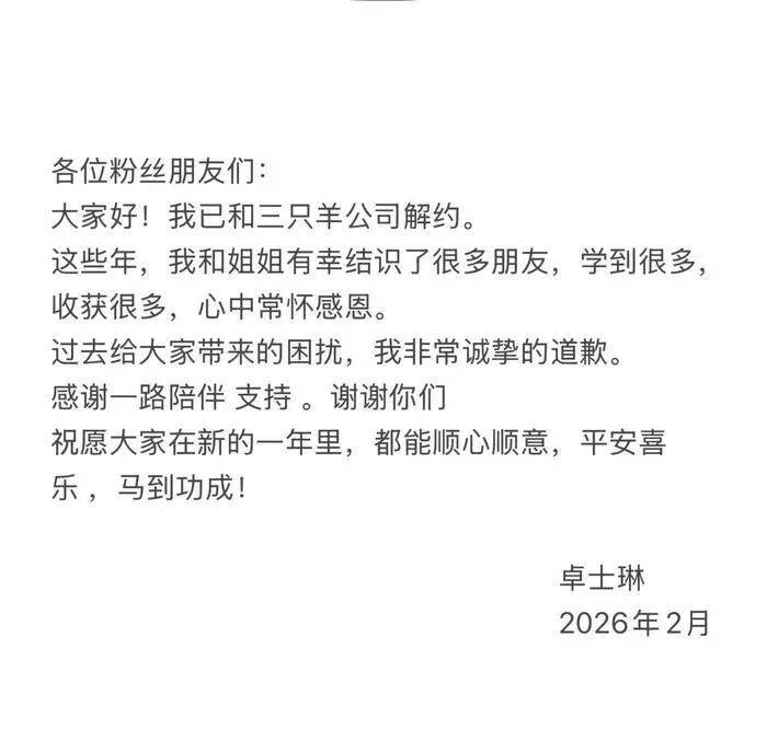 这是继主播“红绿灯的黄”转战海外并移除MCN标识后,三只羊主播阵容的又一次调整。2月3日,卓士琳在抖音发布声明称,已与三只羊公司解除合作关系,并表示对“过去给大家带来的困扰”深表歉意,同时提到自己这些年与姐姐共同成长、收获颇多。七老板则表示,未来将尝试以“更优质的内容回馈观众”。