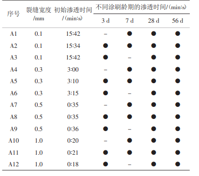 渗透结晶自修复法多采用在配制混凝土时加入渗透结晶型防水剂或在已成型混凝土表面涂一层渗透结晶型的防水涂料。此方法的原理是在混凝土中掺入含活性组分的渗透结晶材料,当混凝土发生开裂且渗水时,活性组分发生化学反应生成新的结晶物质,填充裂缝从而使混凝土密实达到自修复的目的。该方法的局限性在于在有水或湿度较高的环境易激发,受裂缝宽度限制。优点在于可多次修复,直到混凝土内渗透结晶材料逐渐被消耗殆尽。李国权等[3]研究了混凝土不同裂缝宽度、涂刷龄期及混凝土强度对水泥基渗透结晶型防水涂料自修复效果的影响,并改进修复方法。结果表明:迎水面1 mm以下裂缝宽度可完全不透水,有防水作用(见表1);背水面0.3 mm以下的裂缝宽度可以修复,且裂缝宽度越小、涂刷龄期越早,自修复越快效果越好。