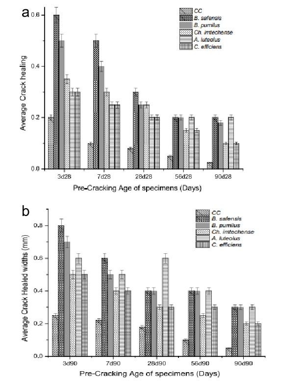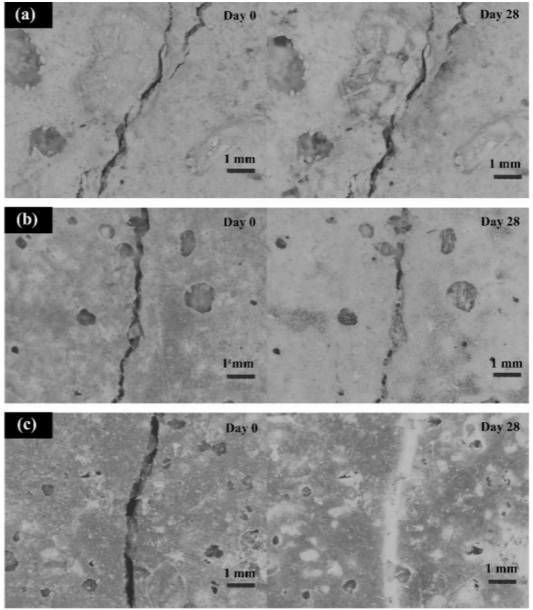 Shaheen等[7]对嗜碱性非孢子原种黄菌、关节杆菌和棒状杆菌作为愈合剂在水泥基环境中的存活时间进行了评估,以检查自修复混凝土的机械性能、自修复和耐久性。结果表明,菌株能沉淀出大量方解石,平均愈合裂缝为0.8mm,强度恢复率为86%。根据裂解后固化期28天和90天后每个裂纹的愈合反应,结果如图4所示。从结果中可以明显看出,生物修复剂的添加增加了开裂前期的裂纹愈合宽度。