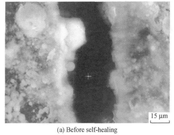 微生物自修复法是基于生物原理的自修复。无害细菌在混凝土中的高碱缺氧环境处于休眠状态,当存在裂纹时,氧气与水分逐渐渗透进入裂缝中,细菌孢子被激活,恢复新陈代谢。代谢中产生的二氧化碳与钙离子反应生成碳酸钙沉淀,从而填补裂缝。生物自修复法的优点在于绿色环保,实用性高,不会受制于修复剂的量,微生物的繁殖能力足以满足修复混凝土。但是,它的劣势在于修复过程相对漫长,对宽裂缝修复作用有限。图3为[6]完全愈合前后菌基标本裂缝的直接立体显微镜观察图。修复宽度为1毫米的裂缝需要在自来水中养护28天(图3a)。在加入营养物质的试样的裂纹中发现了少量的沉淀物(图3b)。