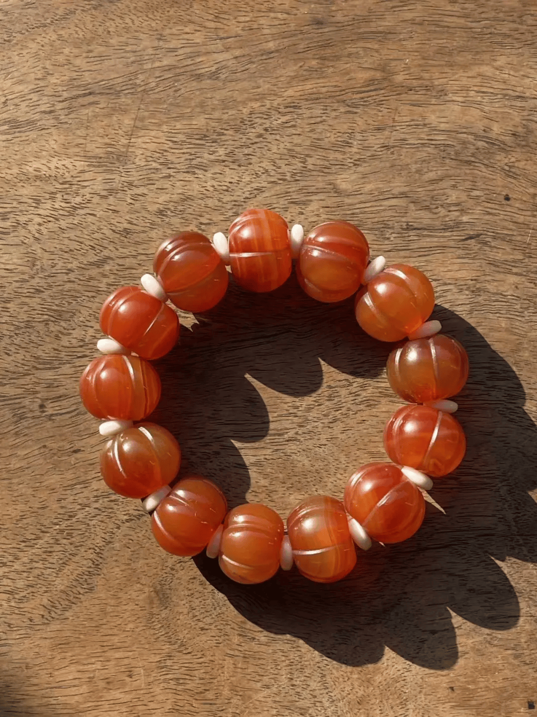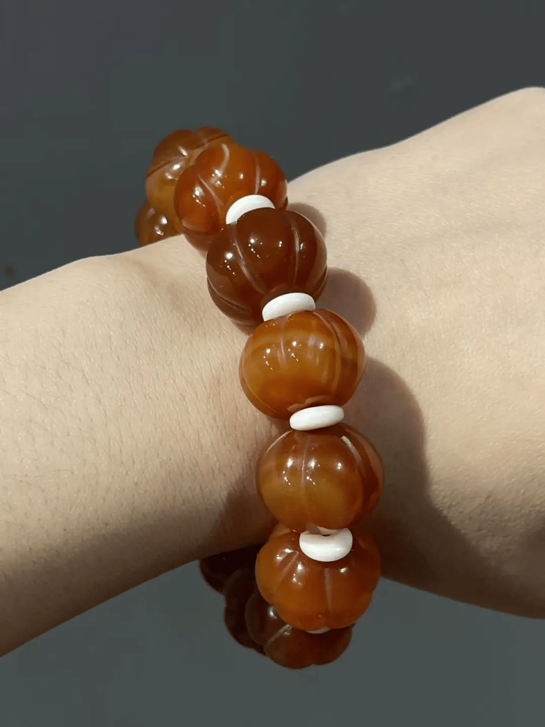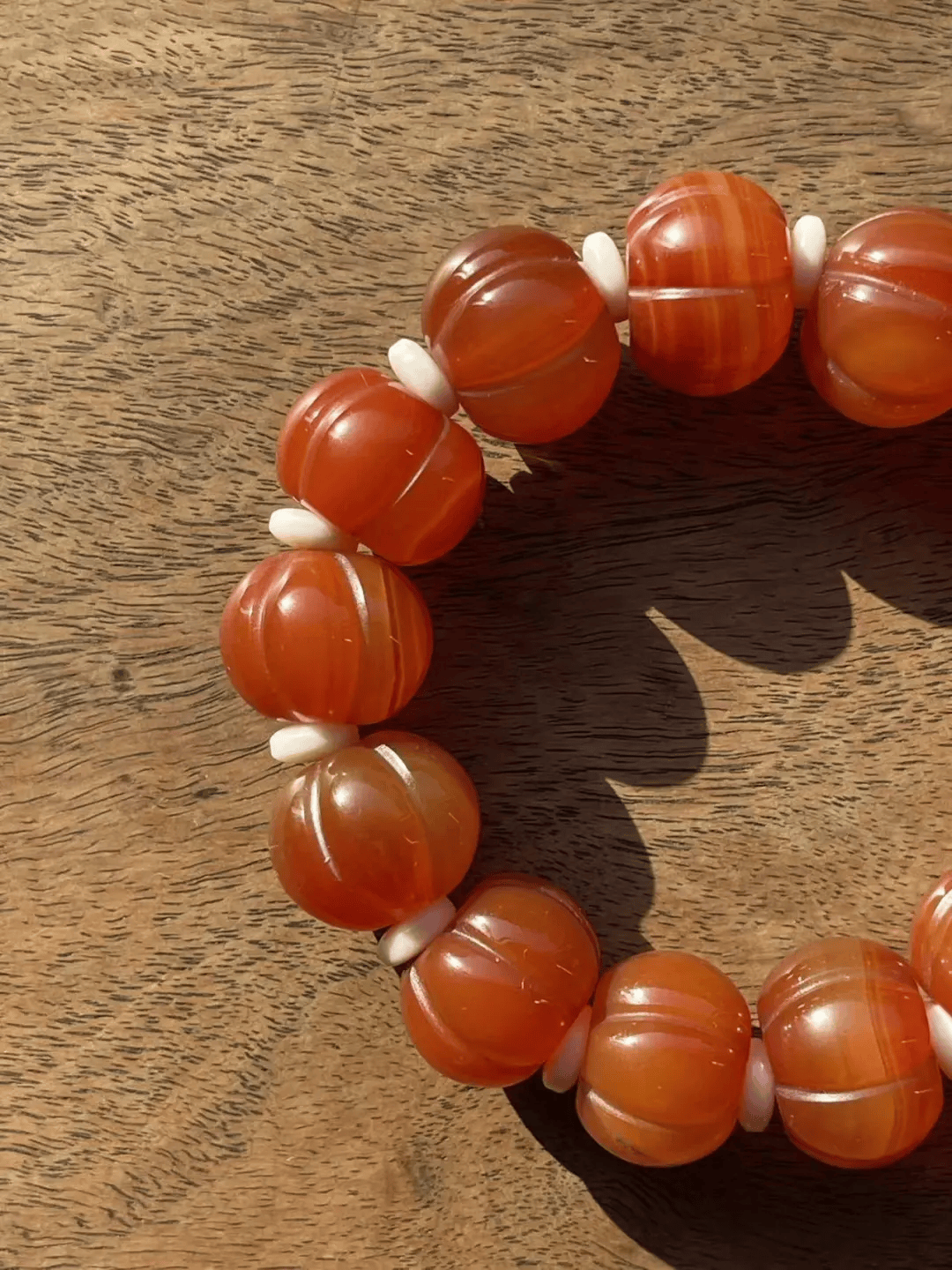 这条手链的老南红玛瑙瓜棱珠,扁圆瓜棱珠形独特、质地半通透、色泽饱满具缠丝纹、风化纹明显细腻、包浆温润、孔道自然磨损痕迹清晰自然、除隐约可见的缠丝纹外纯净瑕疵少,老瓜棱珠扁圆珠共十三粒,橘红半通透色泽靓丽柔美,是较稀有的甘南南红,甘南南红因產于甘肃南方的迭部地区而被称为甘南南红,而且公认为是品质最好的南红品种,比保山南红更胜一筹,有如此组瓜棱珠,除了颜色异常浓烈外,质地细腻光滑,油脂度高,光泽明亮,浑厚感十足。
