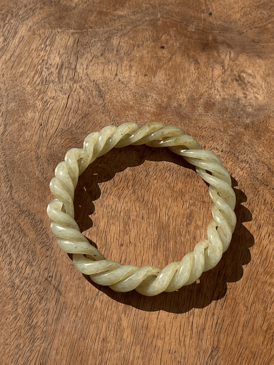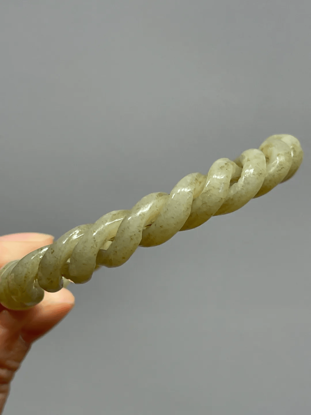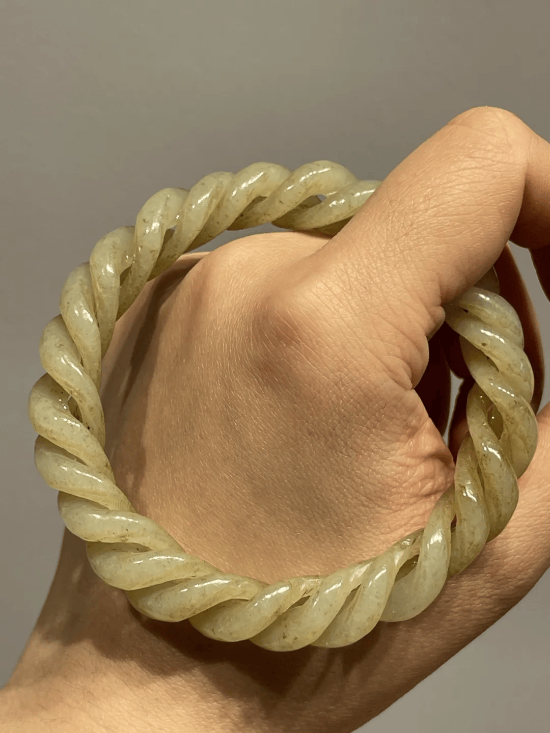 这是一只和田糖沁白玉鏤空透雕而成的活动麻花环手镯,以整块玉石镂空透雕成两条独立活动的扭曲环,整块镂雕无拼接,就是古代俗称麻花手镯的玉雕工艺,以玉质温润细腻之和田糖沁白玉雕出独特手镯,造型典雅贵气,旧时代玉雕技艺精湛,古韵十足,色泽淡褐偶带糖色斑点沁,质地半通透,当代淑女佩戴特显高雅气质与独具一格之品味。
