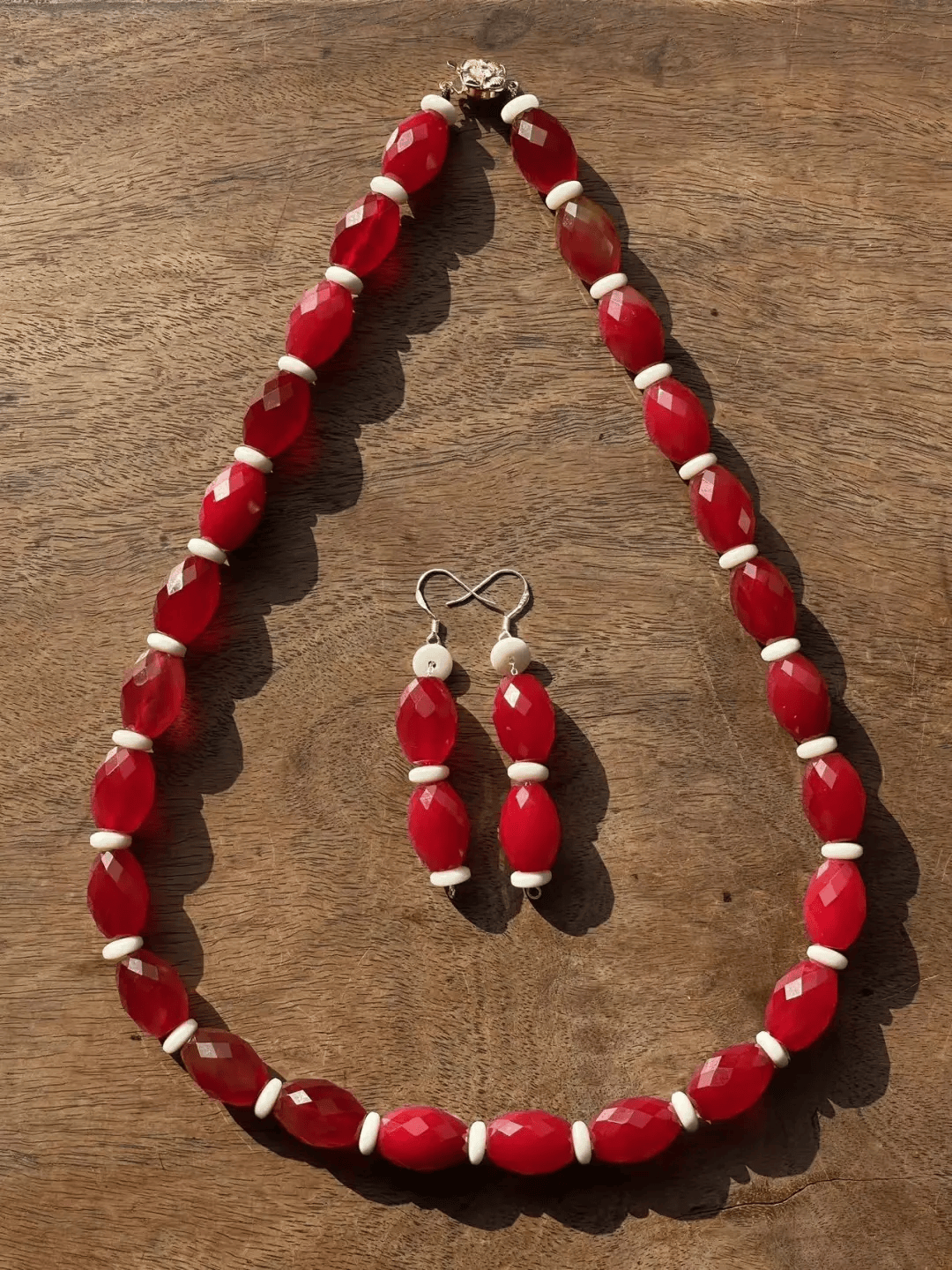 13限时折扣鲜红玛瑙菱格面橄榄珠项链与耳坠套组