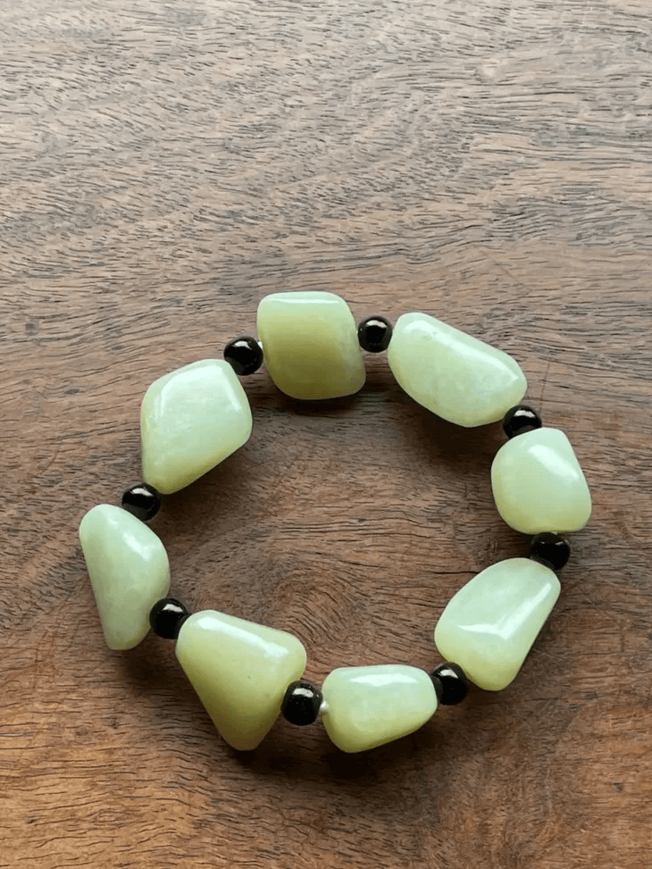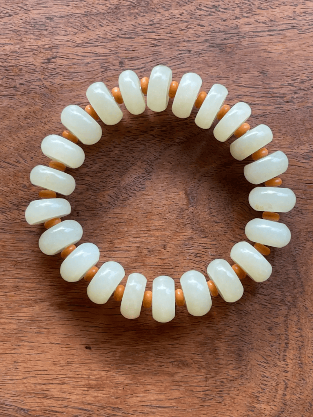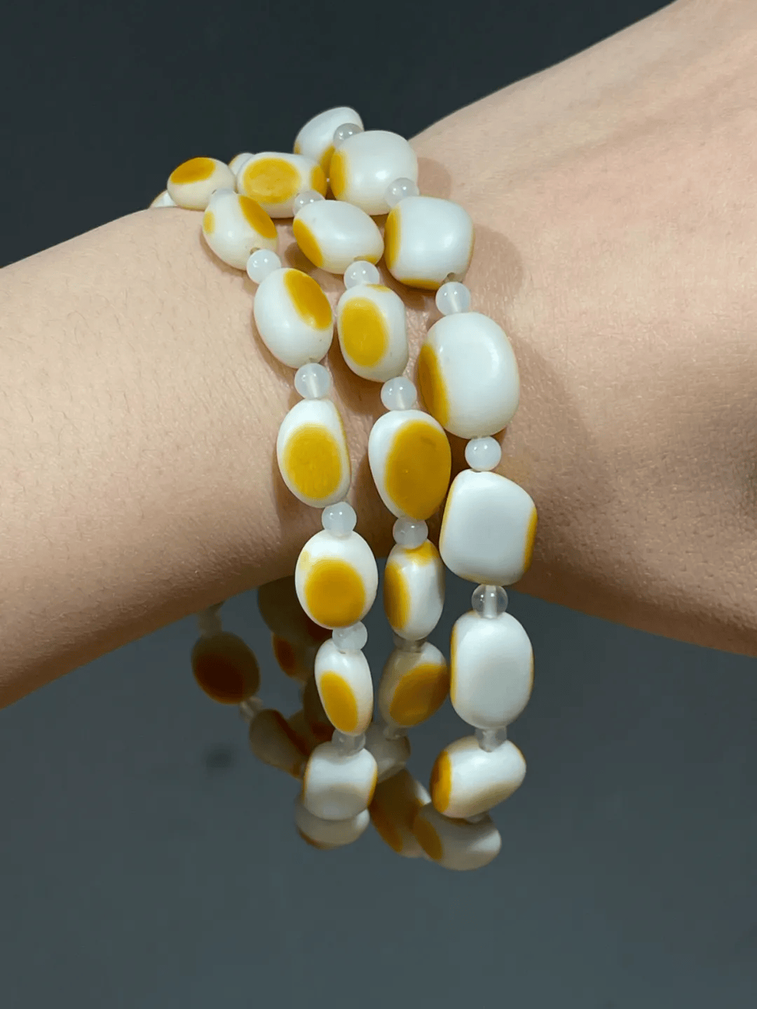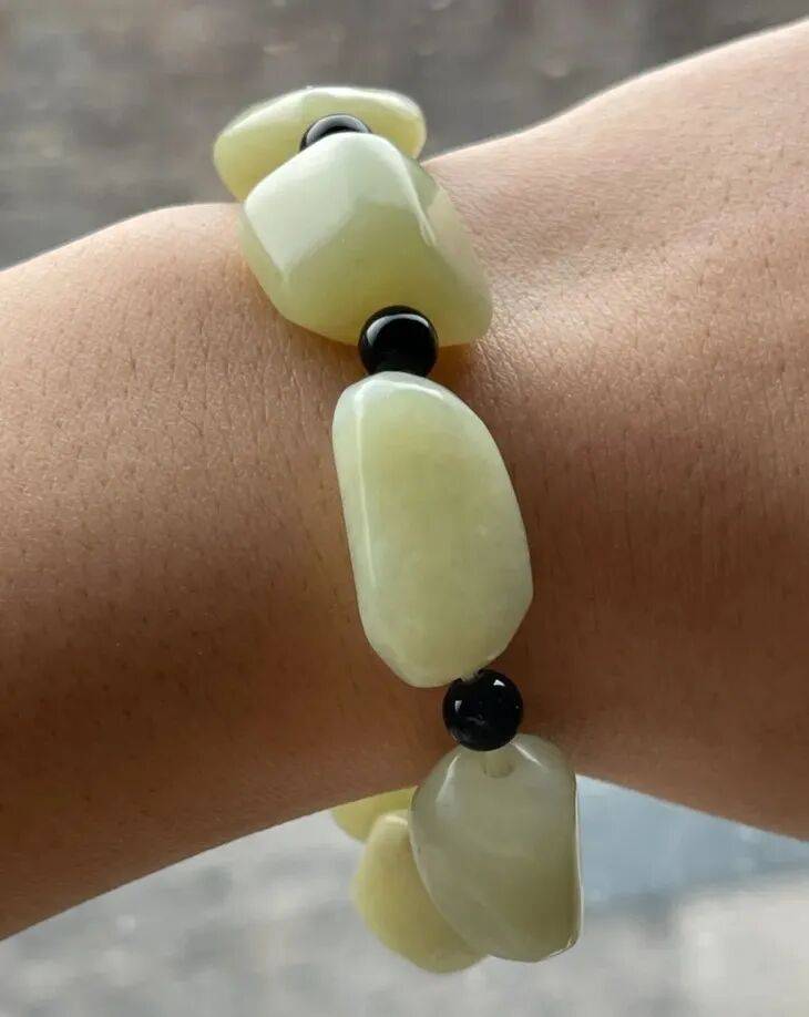 这是一组新疆和田白玉籽儿状随形珠串成的手链,以淡黄白玉琢磨成原石籽儿形珠八粒串成的手链,每粒籽儿珠质地细腻温润,粒粒皆是玉质水润淡黄色的和田籽料白玉,搭配琉璃隔珠以弹性伸缩线串成手链。