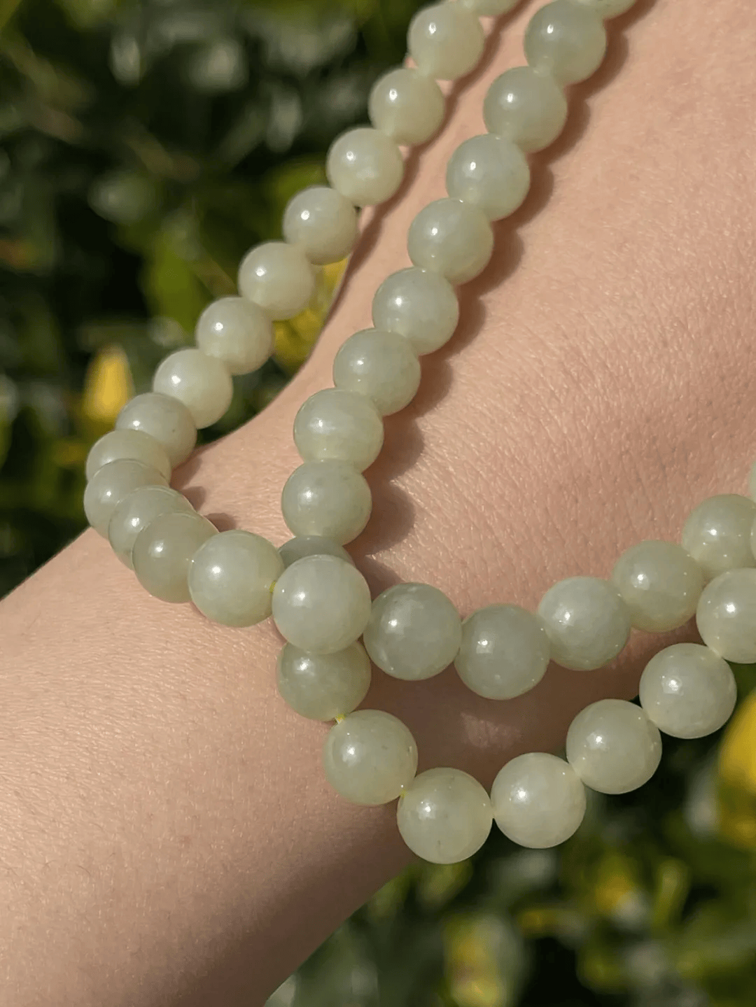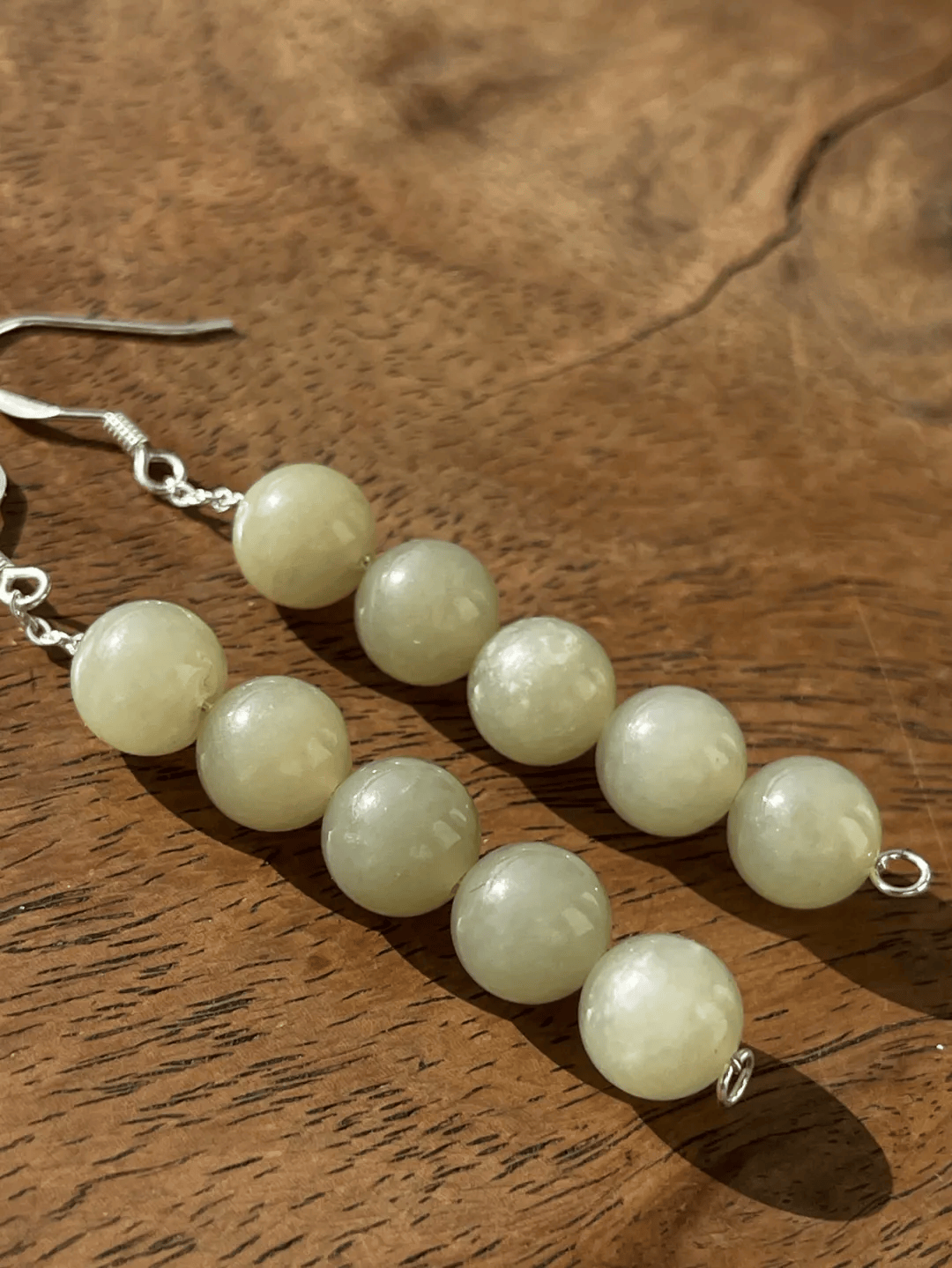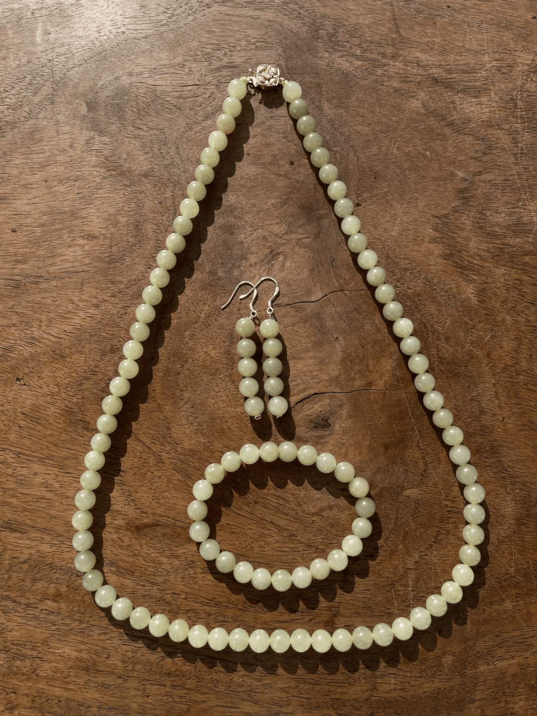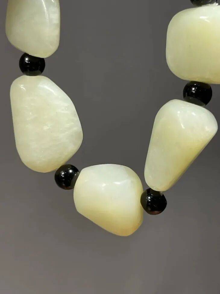 这是一组产于新疆若羌地区的淡青黄色白玉,此种淡青黄色玉俗称和田黄口料,此组黄口料白玉珠共108颗圆珠,设计成淑女项链、银钩耳坠以及手链三件首饰套组。