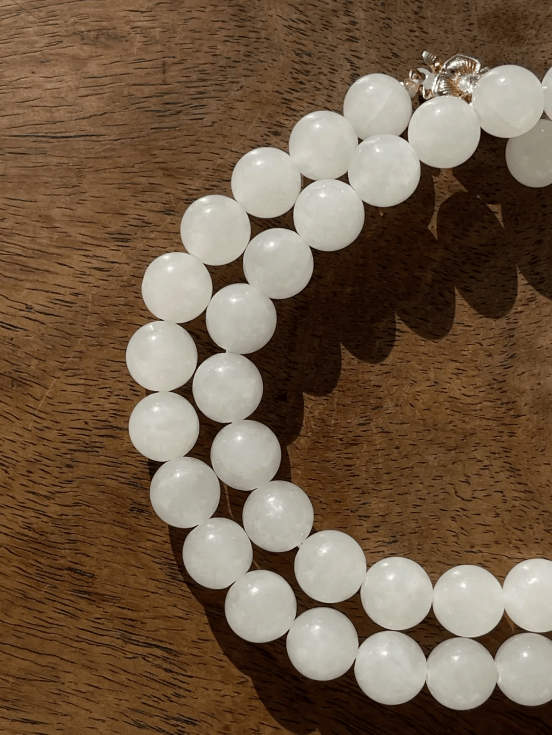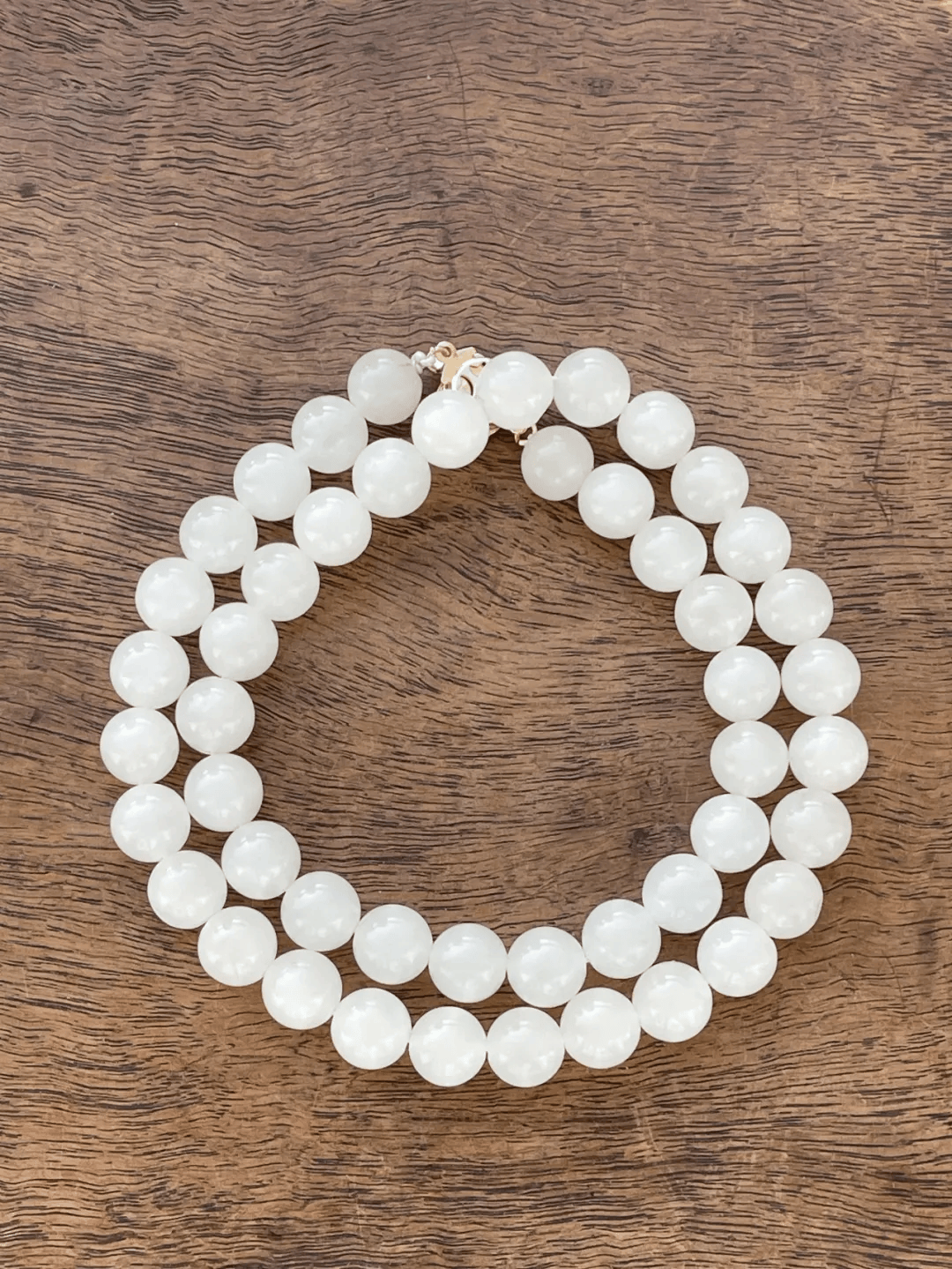 这是一组和田白玉珠共48粒,玉质细腻温润,粒粒皆是玉质水润半通透的纯白无瑕的和田羊脂白玉圆珠,旧时代手工制作与打磨成形,表面光泽细腻不刺眼。
