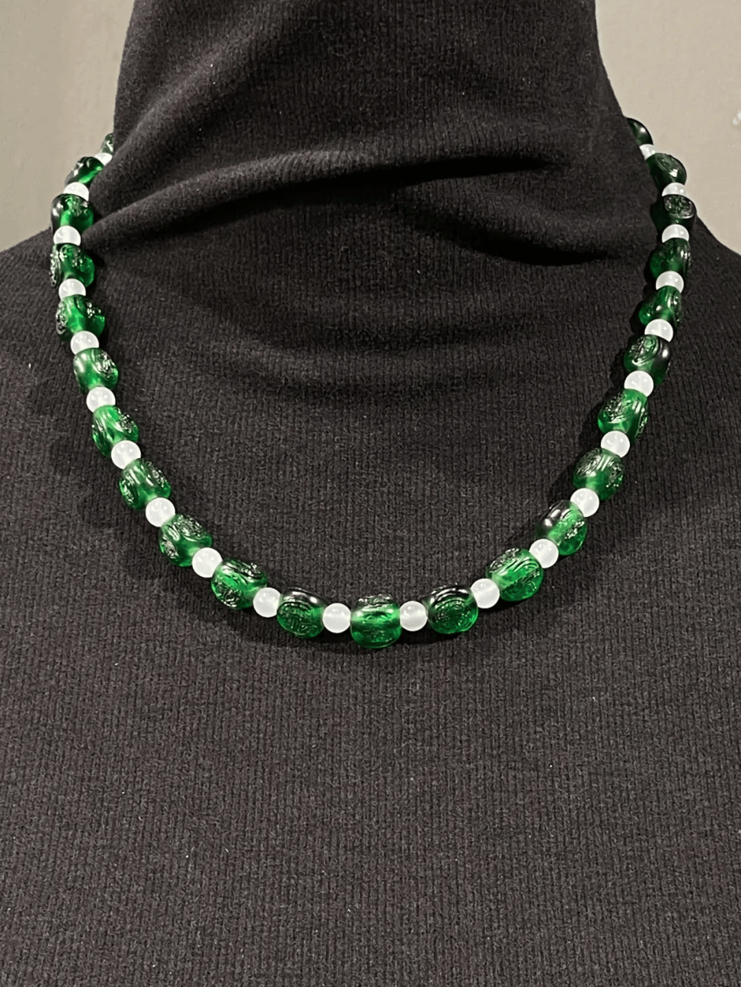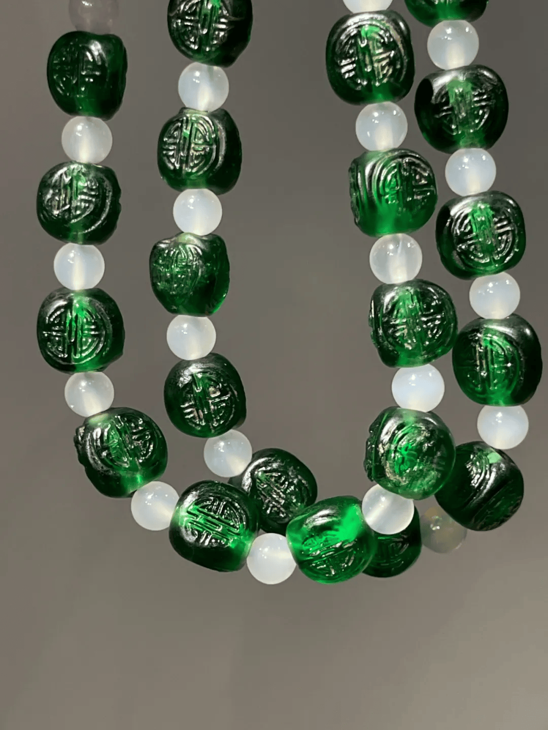 这是一组三十粒老浅浮雕团寿纹翠绿琉璃三面珠搭配白玉髓珠串成的淑女項链,此组翠绿琉璃三面珠色泽鲜艳,珠型独特、三面浅浮雕团寿纹典雅高贵,珠表风化纹清晰细致、孔道大,具有明显因年代久远所形成的磨损痕迹, 是清代首饰或是服饰的配件,材质精良,色泽艳丽、工艺精湛,形式典雅貴气。