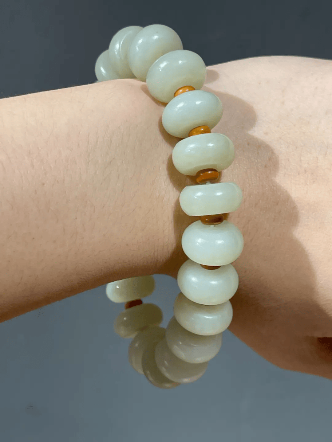 这是一组老坑和田籽料白玉扁圆算盘珠串成的长手链或是手持捻珠,扁圆形大算盘珠共22粒,籽料玉质细腻油润,尺寸颇大,粒粒皆是玉质半通透,淡青白色泽,此组老坑籽料白玉比重大、硬度高,油性与润泽度特别大,是难得一见的老坑和田籽料白玉。