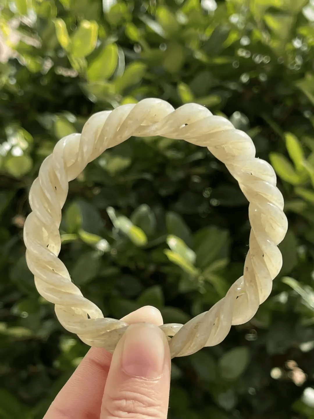 扫二维码收藏【和田糖沁白玉镂雕麻花环手镯】