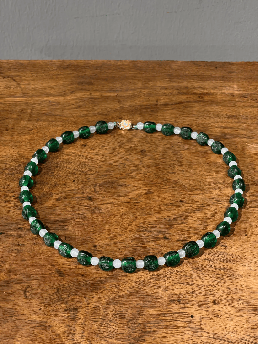 扫二维码收藏【团寿纹翠绿琉璃三面珠項链】
