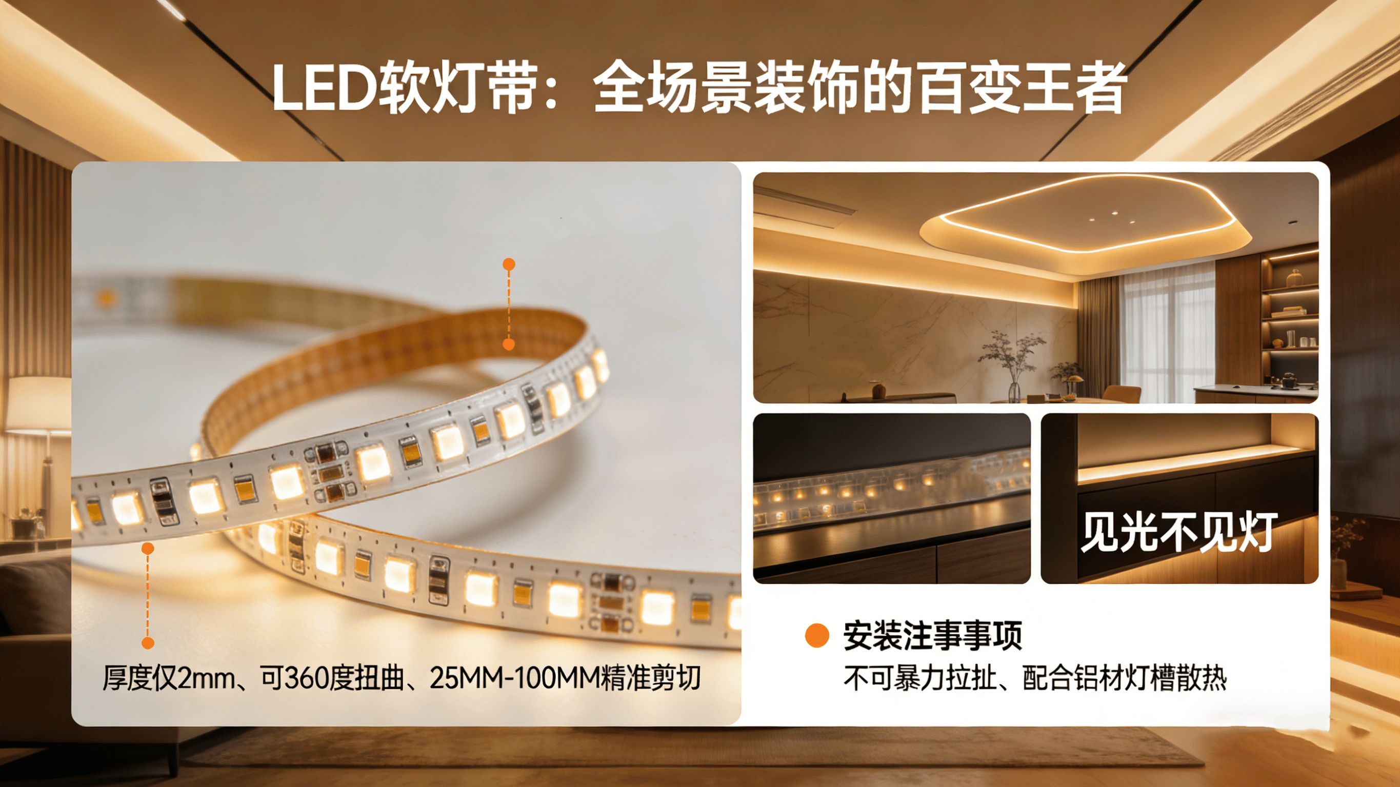 1.4 应用效果与场景: 常用于 暗槽灯光、室内背景墙、不规则天花吊顶 以及 家具层板灯。应用效果是那种“见光不见灯”的高级感。