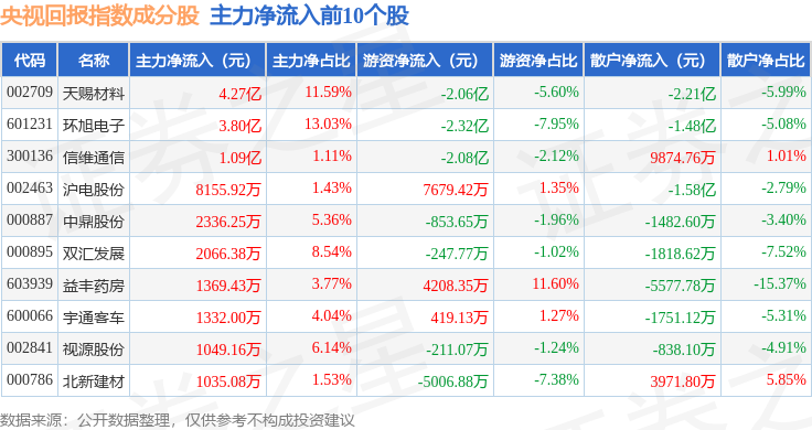资金流向方面,央视回报(399553)指数成份股当日主力资金净流出合计2.88亿元,游资资金净流入合计1.63亿元,散户资金净流入合计1.26亿元。成份股资金流向详情见下表: