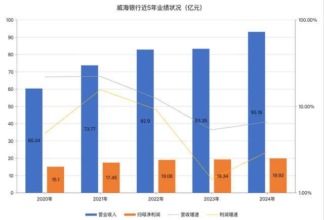 近几年,受到净息差持续下行的影响,威海银行营业收入增速下滑较为明显。2020年至2024年,该行营业收入增速分别为21.97%、22.26%、12.38%、5.36%、6.64%。但威海银行仍一直保证营收、净利润双双增长,在银行业整体承压的大背景下,这样的成绩已经很难得。