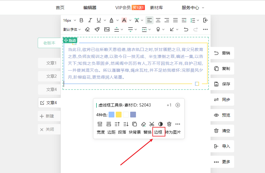打开小墨鹰编辑器,先挑选一款心仪的边框单素材添加到编辑区,接着点击边框素材中的虚线框,激活编辑状态,准备进行后续调整。