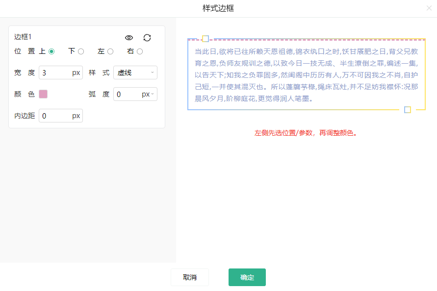 步骤三、在出现的弹窗中可以调整边框的风格,如边框位置、边框宽度、边框颜色、边框样式、边框弧度、内边距;点击右上角的“预览”,右侧可以实时展示修改的效果;点击右上角的“重置”,可以重新设置边框。