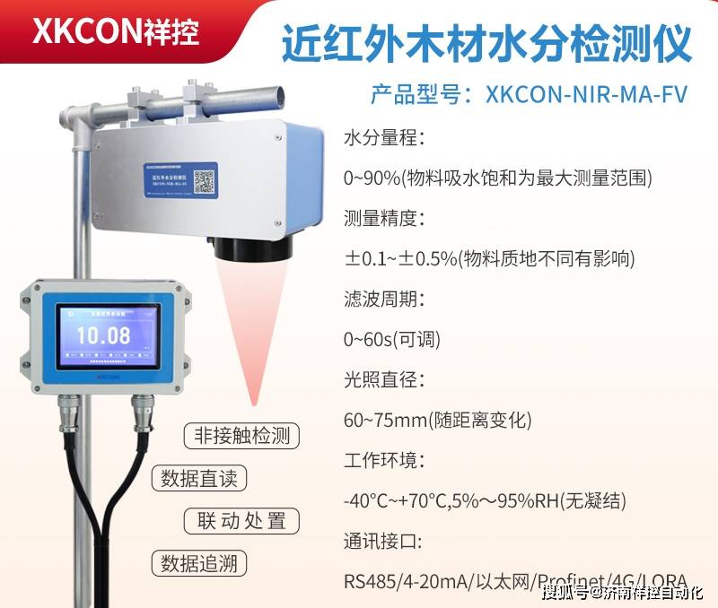 济南祥XK-NIR-MA-FV型在线近红外水分仪可直接测试木材含水率,测定所需的时间短,使用简便,不破坏样品,比烘干法、电测法和湿度法等检测方式更优异,可全面提升木材含水率检测水平。
