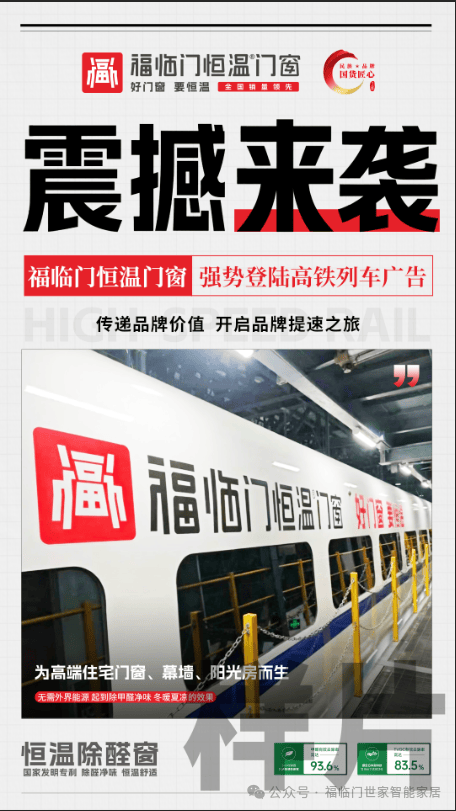 中国高铁,是“中国速度”的鲜活注脚,更是“中国智造”的璀璨明珠。它宛如一条奔腾不息的钢铁巨龙,以其庞大的客流量、风驰电掣般的传播速度以及广泛无垠的覆盖范围,成为品牌曝光不可多得的黄金渠道。福临门恒温门窗以敏锐的市场洞察力和前瞻性的战略眼光,精准捕捉这一时代机遇,借势“中国速度”开启品牌发展的崭新征程。凭借精准聚焦的传播策略,如同在广阔的市场海洋中精准投放渔网,实现对目标消费人群的高密度覆盖,开拓出一片更为广阔的消费市场蓝海,助力品牌实现跨越式的升级蜕变,在激烈的市场竞争中脱颖而出。