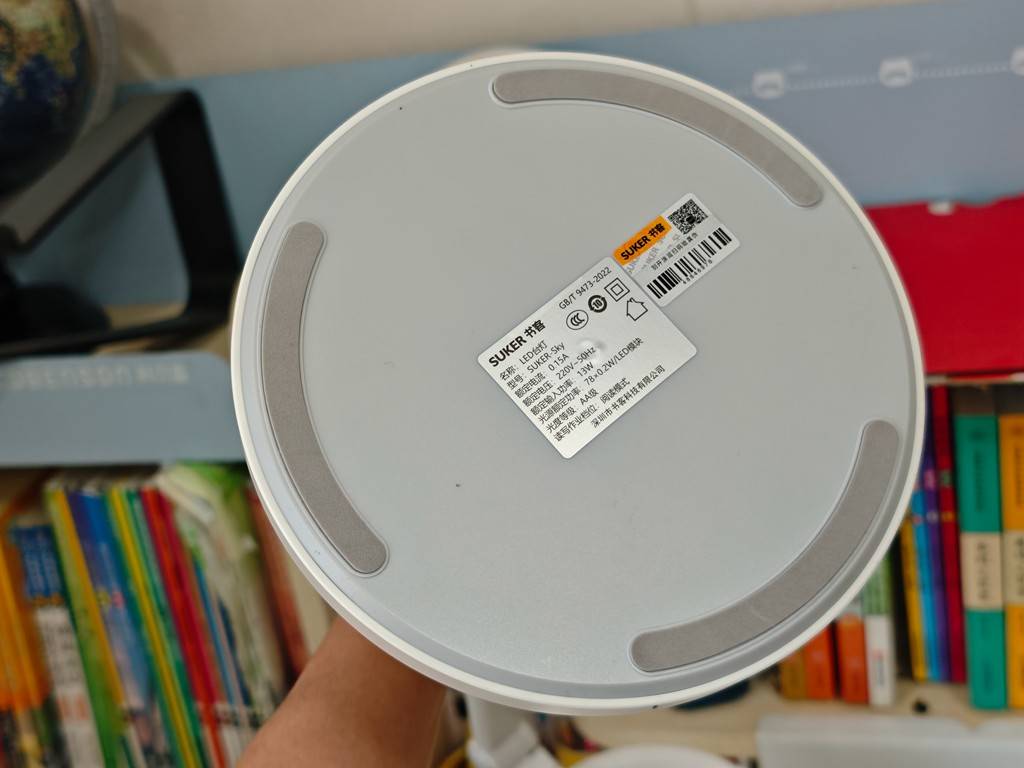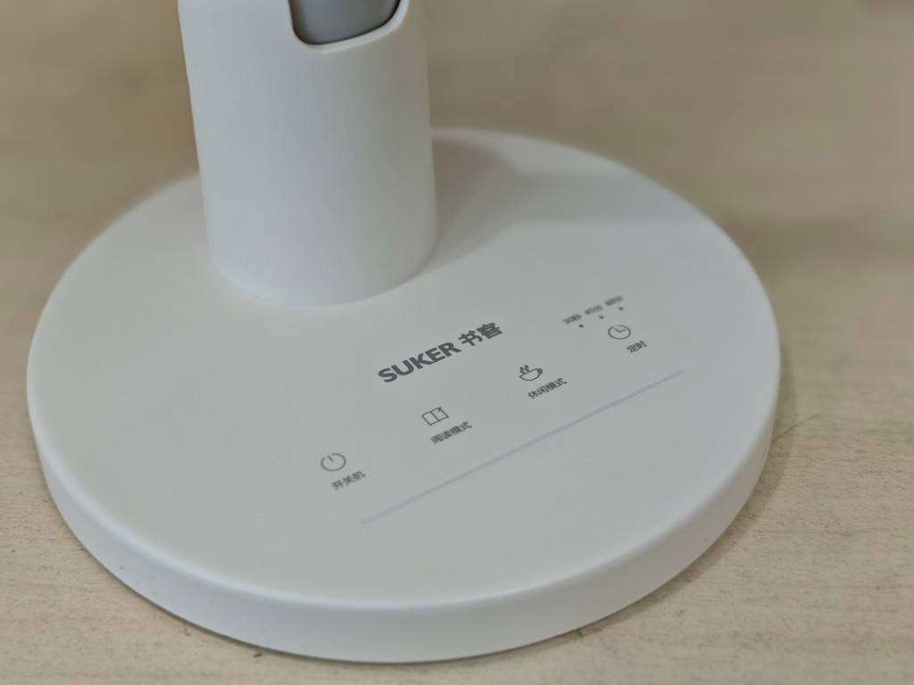底座是圆形设计,面积适中,放在书桌角落不会占用太多空间,底座上的触控按键清晰明了,有开关键、亮度调节键、模式切换键和定时键,按键灵敏度很高,孩子自己就能轻松操作,不用每次都麻烦家长。底部一侧还有防滑减震的垫脚这让台灯有了稳定的放置效果。