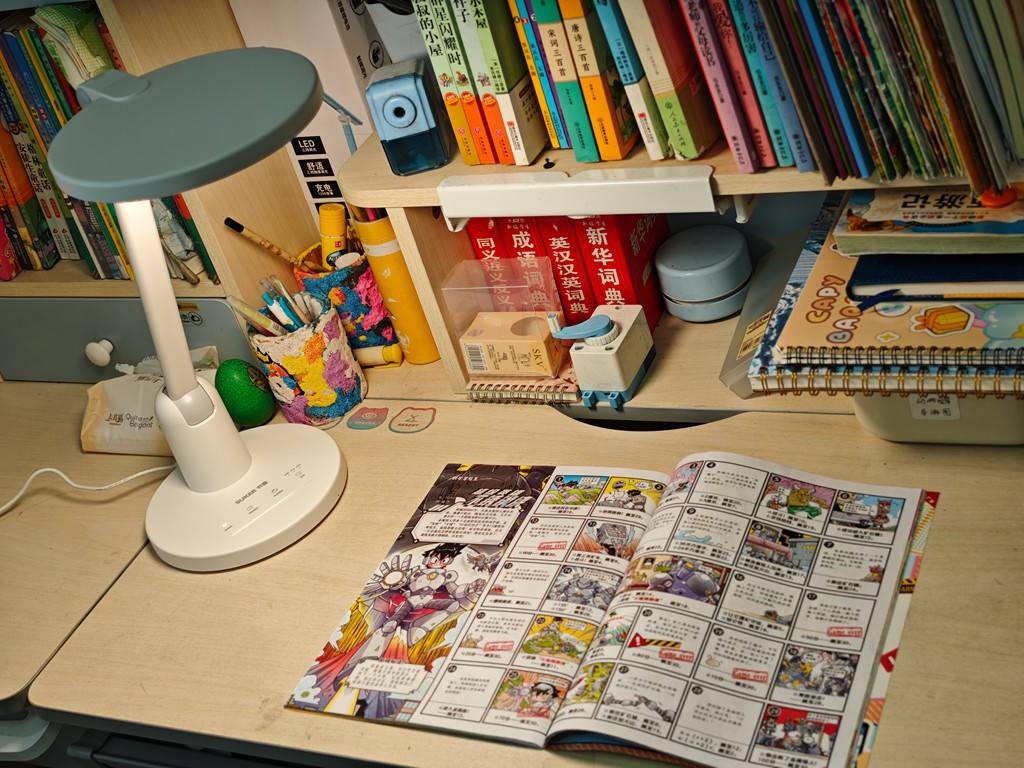 “明”的维度,书客SKY是一款全光谱护眼台灯,能99.8%高度还原太阳自然光,光线柔和不刺眼,显色指数高达Ra98,能真实还原纸张和笔迹的颜色,孩子看课本时,文字清晰锐利,看彩色绘本时,色彩饱满逼真,和白天在自然光下看书的感觉几乎一样,有效避免了因光线偏色或模糊导致的用眼疲劳。而且它的照度远高于国AA标准,搭配DT多维漫射2.0技术,模拟太阳光线轨迹,通过多层折射和散射,让光线均匀覆盖整个桌面,没有亮斑和暗区,哪怕是书桌边缘的橡皮、尺子,也能看得清清楚楚。