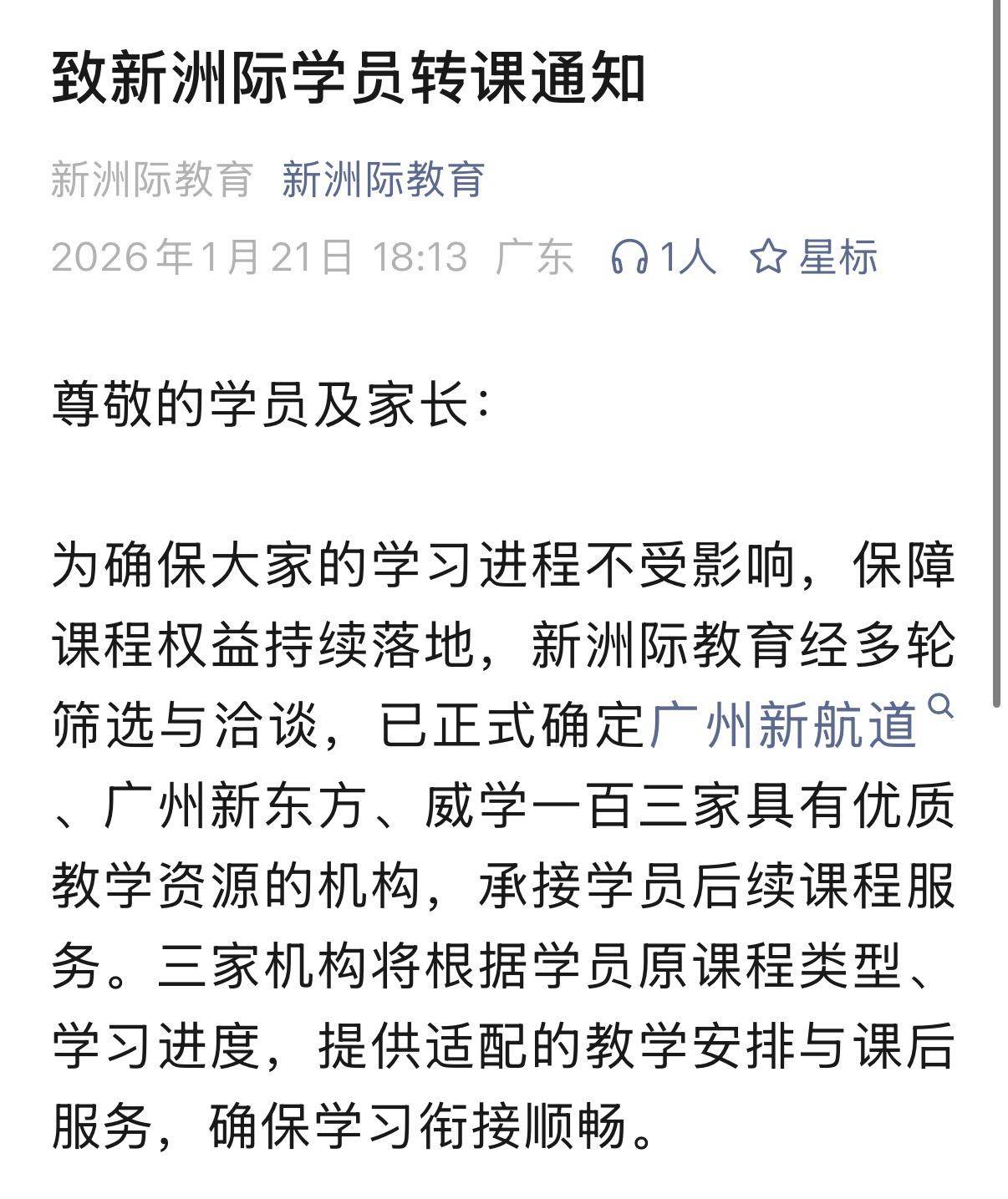 1月21日,新洲际教育官方微信公众号发布了《致新洲际学员转课通知》。