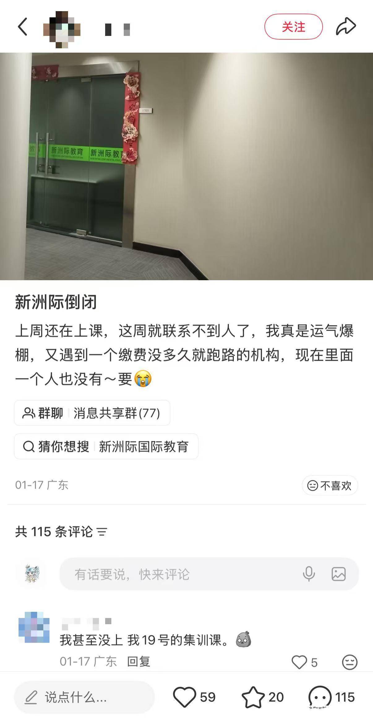 自1月17日起,在社交平台上有网友称“新洲际教育倒闭了”。