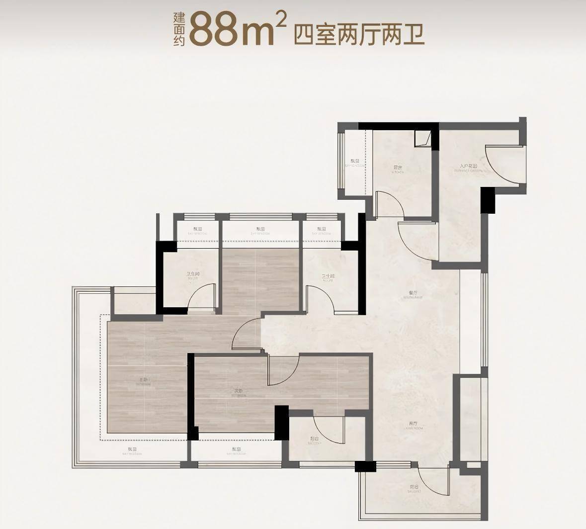 2、建面约88㎡四室两厅两卫,比同等面积多一房