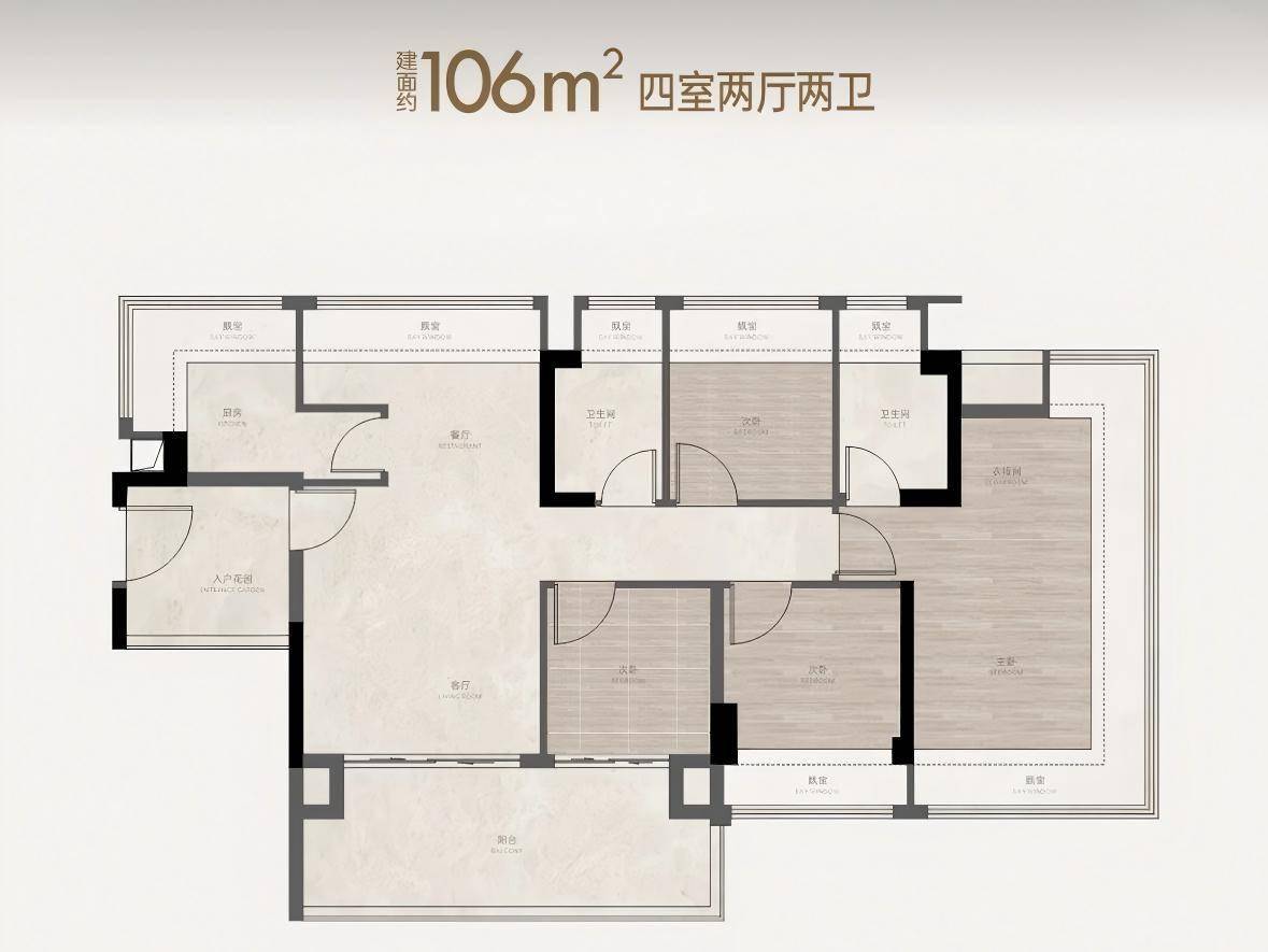 3、建面约106㎡四房,五开间朝南