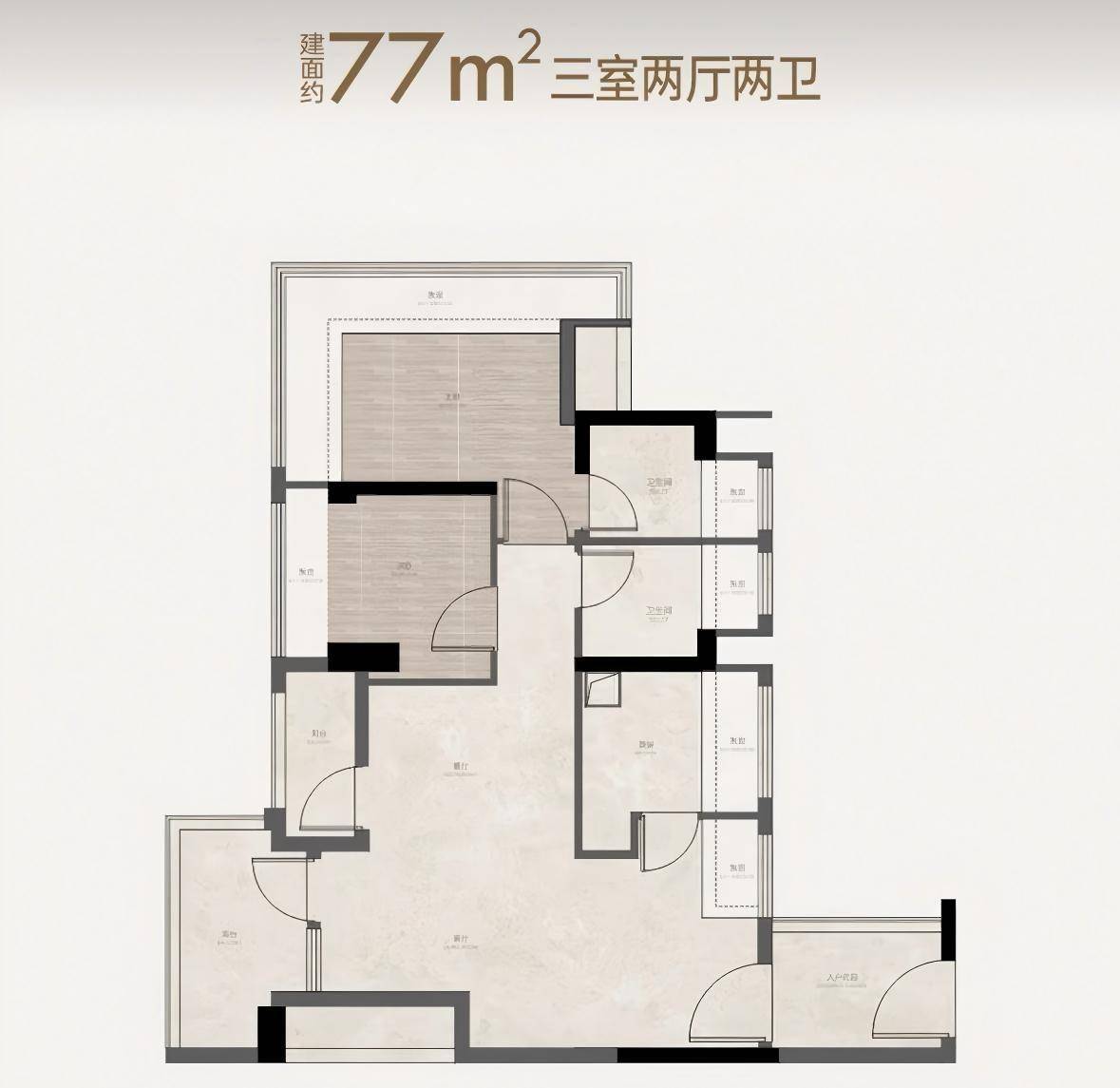 1、建面约77㎡实现了三房两卫,且带有入户花园