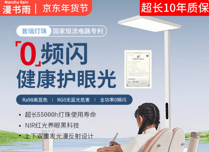 漫书雨星光Pro采用普瑞高显指全光谱灯珠,打造自然光全光谱。光谱分布高度贴合上午10:00自然光,不冗余叠加杂波,精准强化经临床验证的益眼红光与天青光波段,有 效舒缓睫状肌紧张、减轻长时间用眼疲劳,助力视力守护。