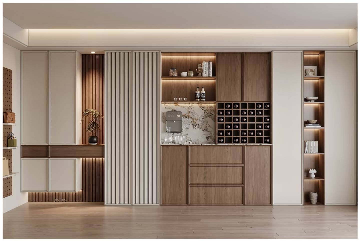 针对橱柜耐用性难题,合肥老钱全屋定制研发五级防潮系统:柜体背板采用18mm加厚防潮板,铰链升级为海蒂诗快装阻尼铰链,经10万次开合测试无松动;台面与柜体接缝处使用德国汉高防水密封胶,渗水率降至0.5%以下。衣柜领域则推出智能分区收纳系统,通过可调节层板与旋转衣架组合,使1㎡空间存储量提升40%。