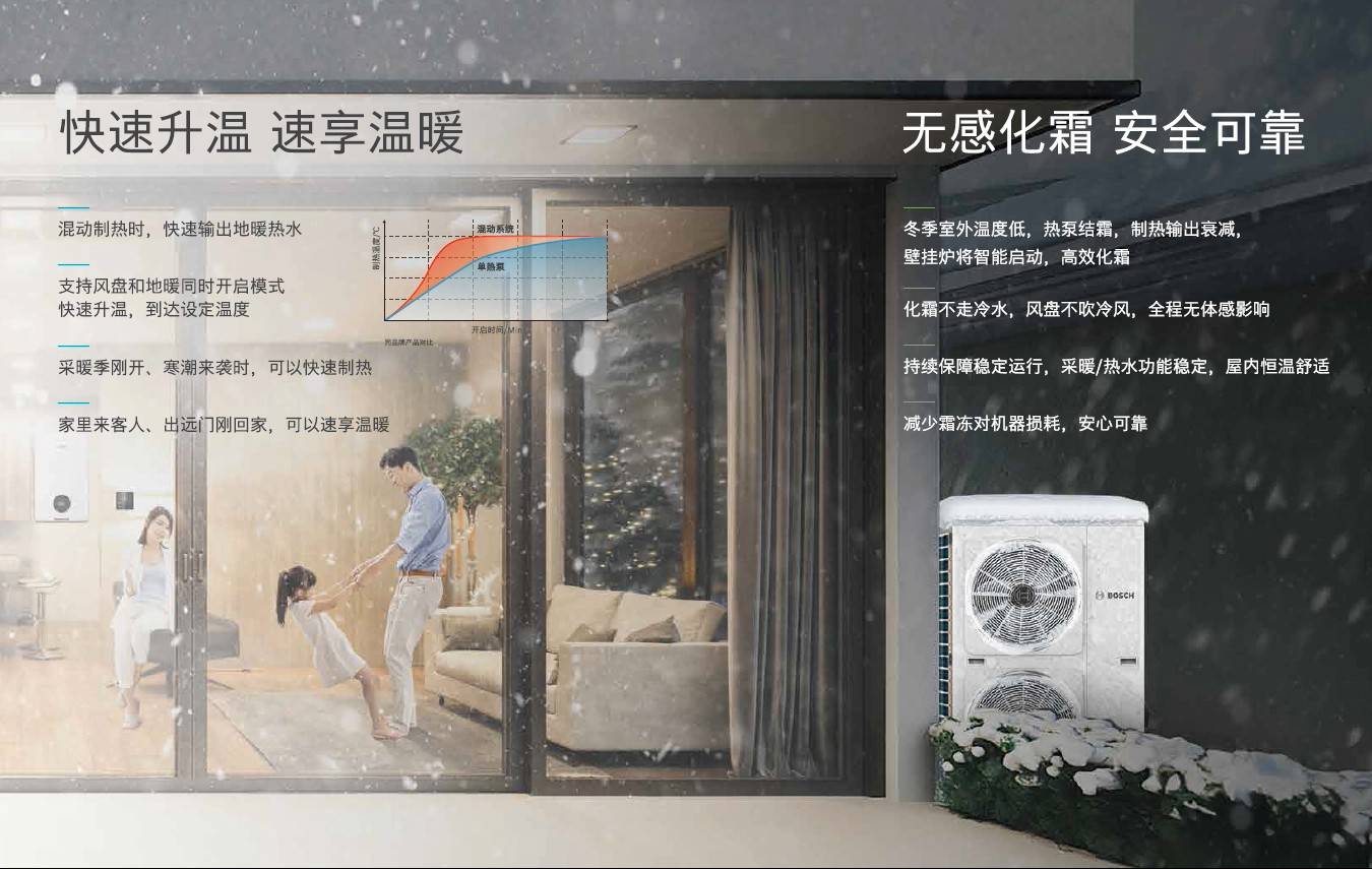 冬季室外温度低,热泵结霜,制热输出衰减,壁挂炉将智能启动,高效化霜化霜不走冷水,风盘不吹冷风,全程无体感影响持续保障稳定运行,采暖/热水功能稳定,屋内恒温舒适减少霜冻对机器损耗,安心可靠