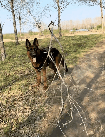 晨光熹微,林间小径还挂着昨夜的露珠,一只名叫Gaia的大德牧,正对着一截横卧在草丛中的庞然大物,陷入了某种庄严的沉思。