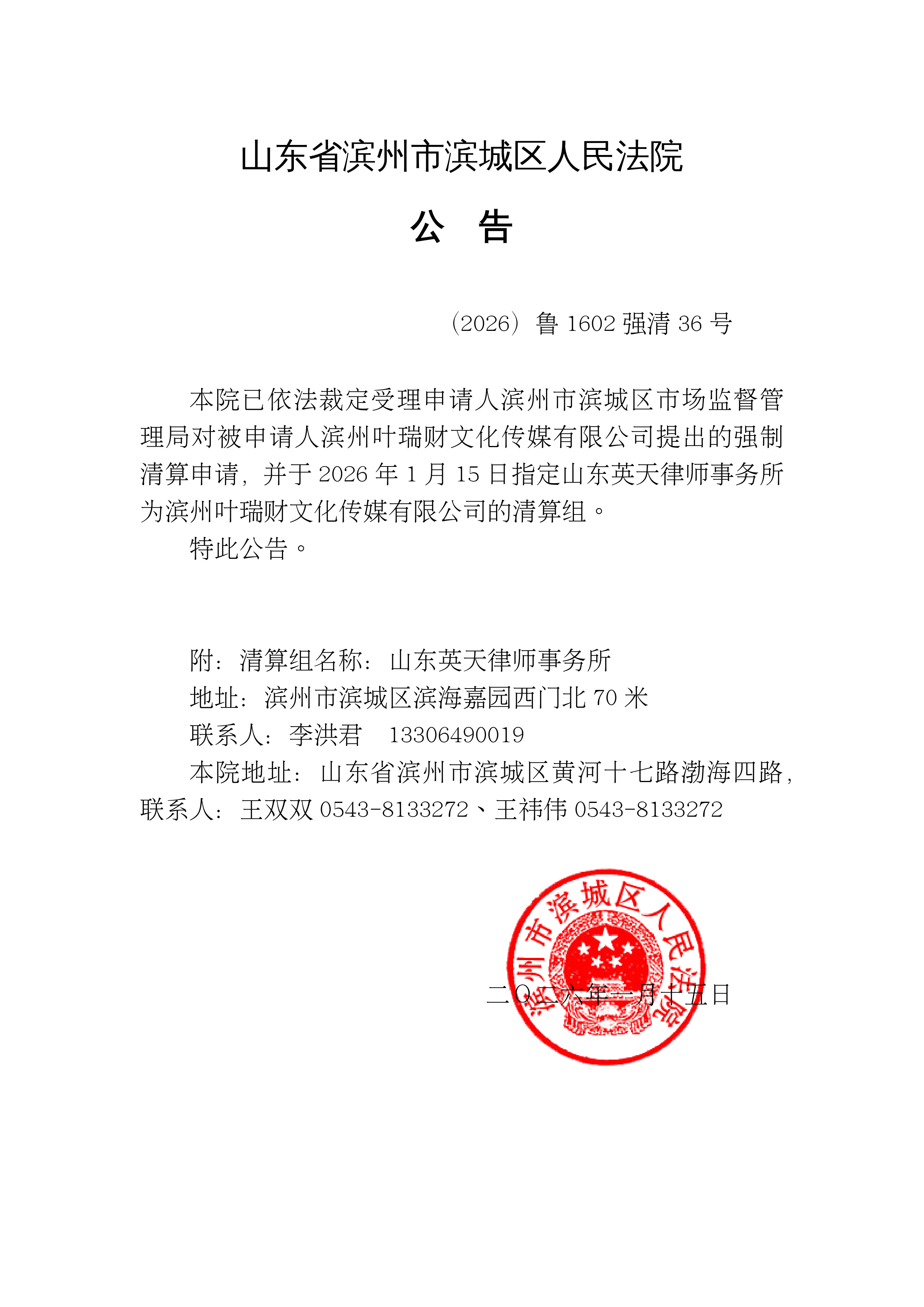 (2026)鲁1602强清36号2026强清36号指定管理人公告