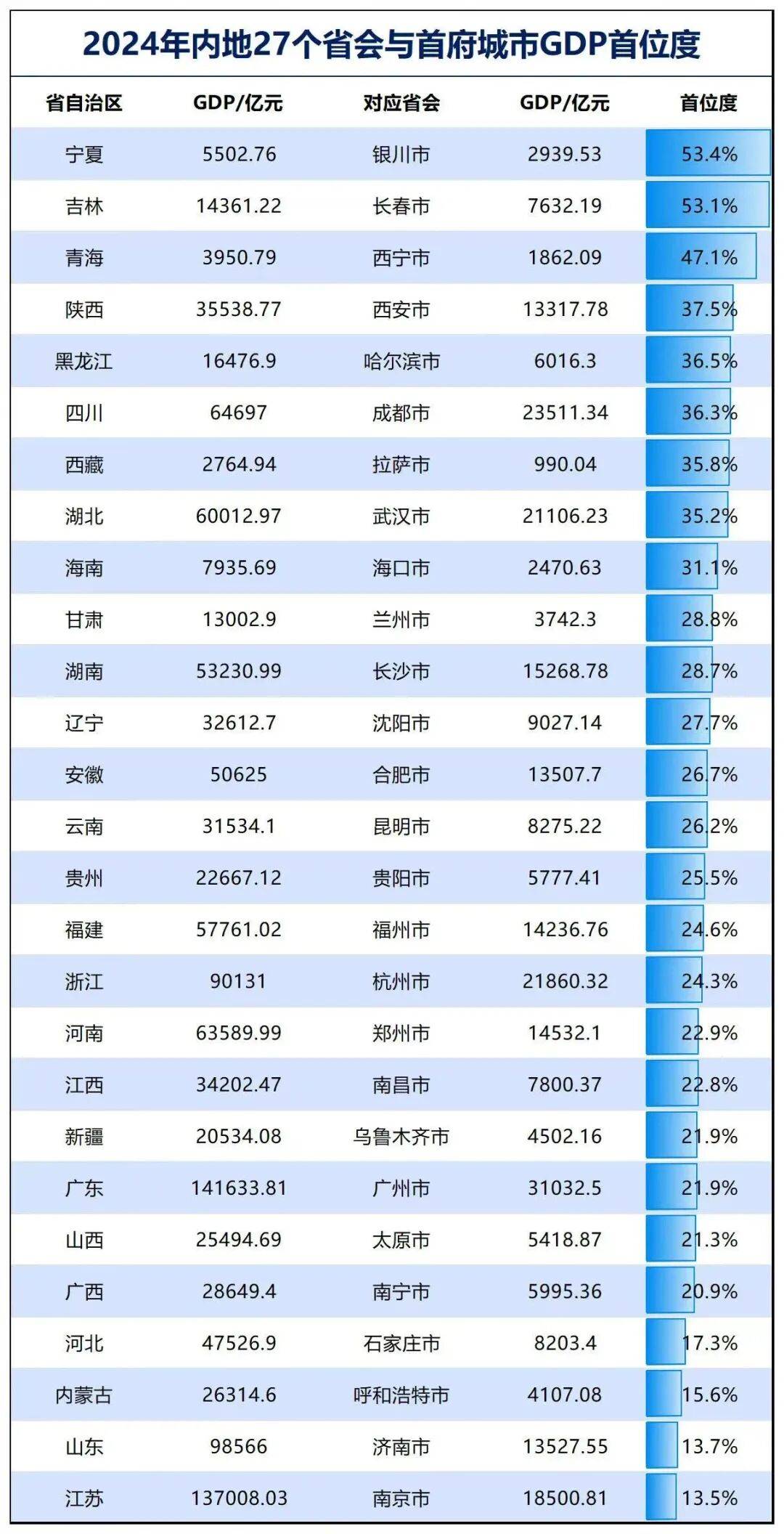 从首位度看,长春的首位度超过50%,在全国仅次于银川。