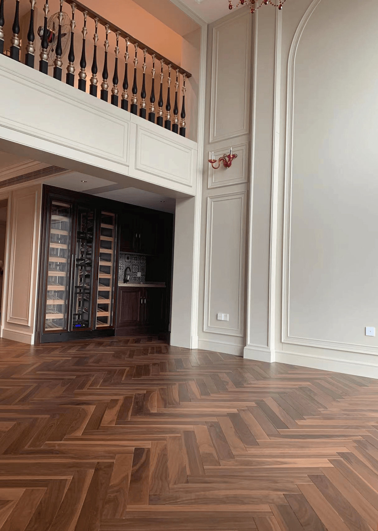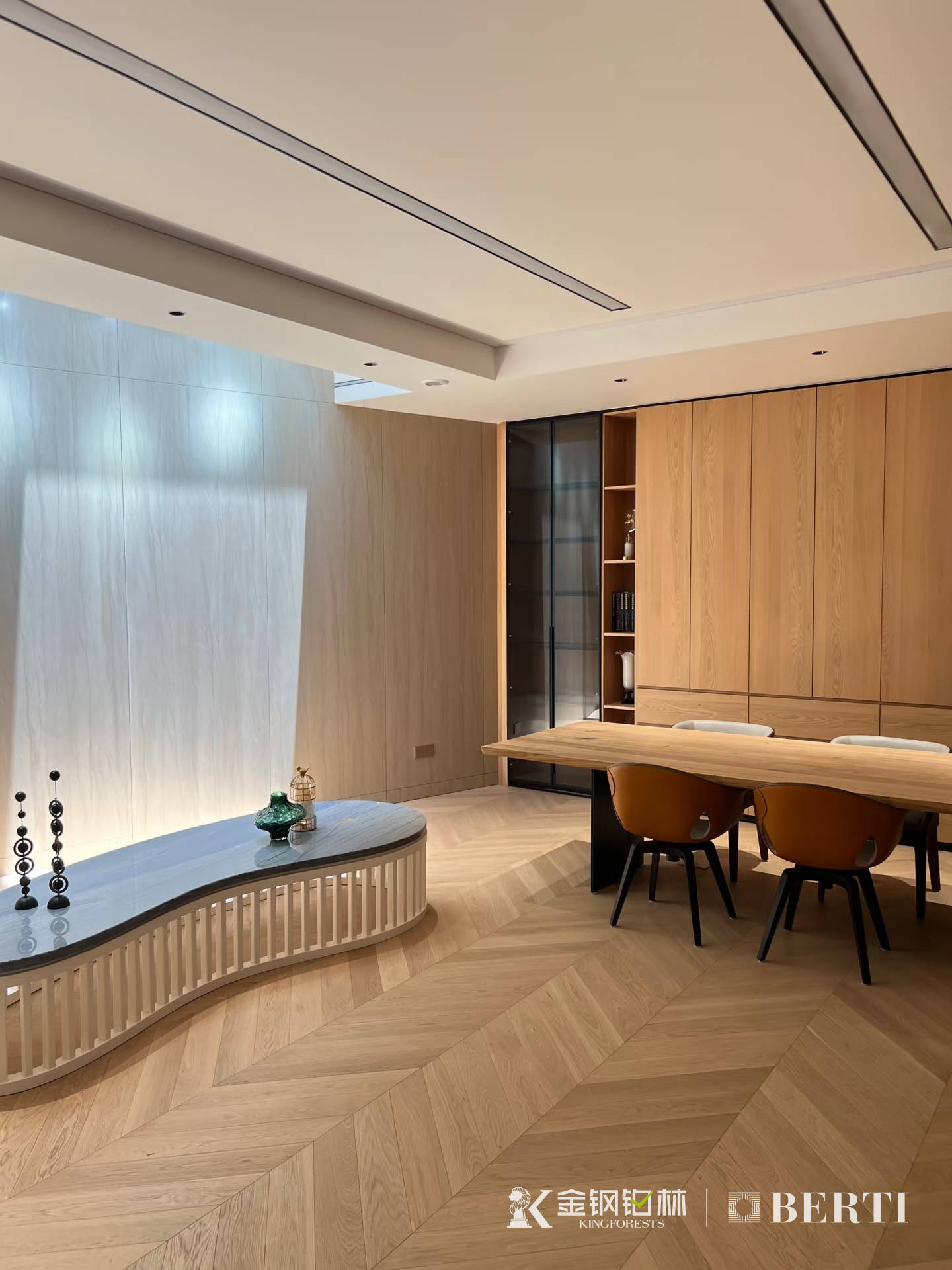 艺术拼花地板则是奢华工艺的典范,以百年树龄的名贵木种为原料,融合胡桃木、柚木等优质基材,凭借精湛拼花工艺打造独特美学效果,受欧洲木材资源保护政策及复杂工艺限制,产量稀少且多为限量定制款,主打极致工艺质感与收藏价值,对应的欧洲原装进口木地板价格居高不下。金钢铂林旗下意大利Berti 艺术拼花系列为代表,适配豪宅、别墅及高端商业空间,彰显皇室级奢华格调。
