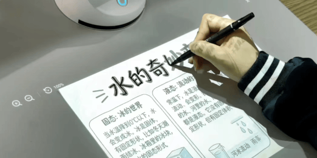 系统内置的20000余条名师视频、1000余本校内外同步教材全部免费开放,搭配AR纸电交互功能,实现“哪里不会指哪里”的沉浸式学习。全新加入的意图识别引擎,能自动识别题型与考查意图,匹配定制化分析策略,帮助孩子真正理解知识而非机械记忆。V2.3版本升级的“手抄报AI设计”功能,更能快速生成设计方案,大幅缩短创作时间,进一步降低用眼时长。