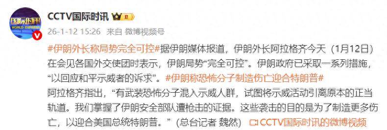 据CCTV国际时讯援引伊朗媒体报道,伊朗外长阿拉格齐在1月12日与各国外交使团会晤时指出,当前伊朗的局势完全可控。他强调,伊朗政府已经采取了一系列措施,以回应和平示威者的合理诉求。然而,阿拉格齐也提到,有一些武装恐怖分子混入示威人群,试图将这些示威活动引离原本的正当轨道。伊朗方面已经掌握了相关证据,证明伊朗安全部队曾遭到枪击袭击,袭击的目的是为了制造更多的伤亡,进而为美国总统特朗普提供借口。