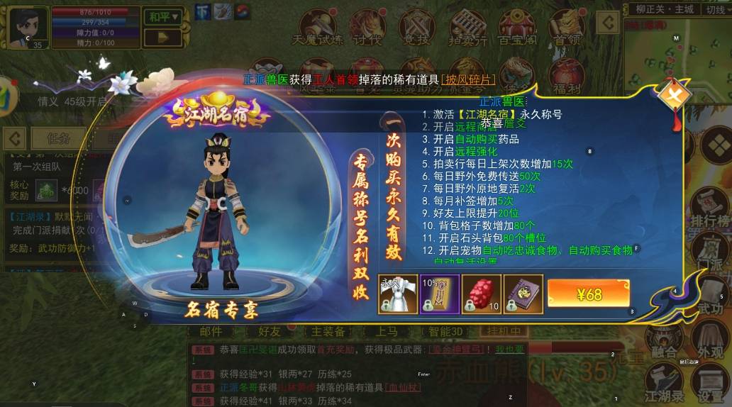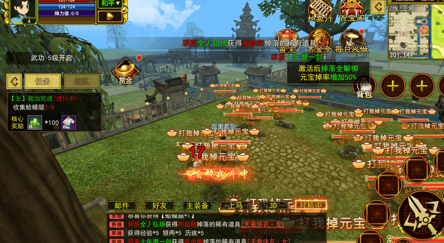 35级二转后,前往 南明湖 刷怪,此处金元宝掉落翻倍,建议组固定队前往,医师职业此时作用显著。